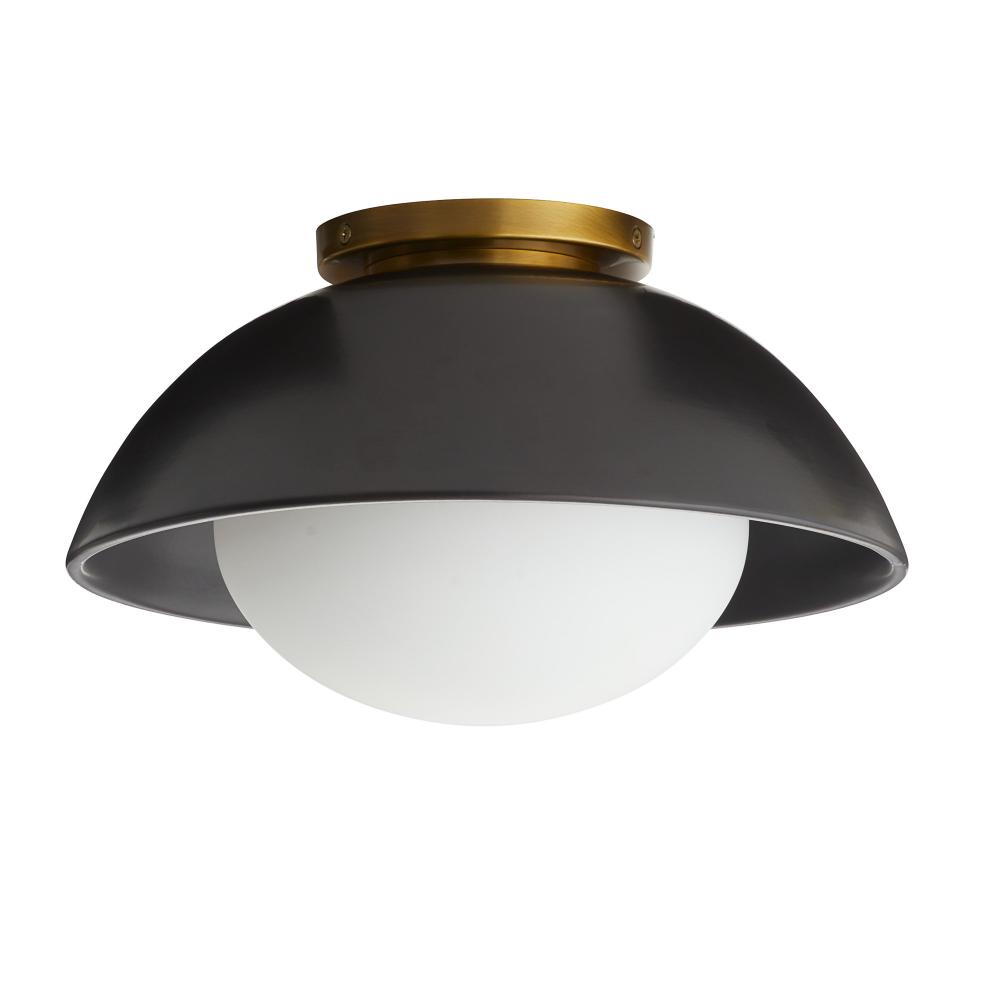 THE GLAZE SMALL FLUSHMOUNT LIGHT PAIRS SOFT OPAL FROSTED GLASS WITH A MATTE BLACK CERAMIC SHADE AND ELEVATED WITH ANTIQUE BRASS-PLATED STEEL. INSPIRED BY HAND-CRAFTED TABLEWARE AND FINE CERAMICS THAT REVEAL THE HAND OF THE MAKER. COMPELLING ENOUGH TO STAND ALONE, THE SMALL FLUSHMOUNT ALSO OFFERS ENDLESS POSSIBILITIES WHEN INSTALLED IN MULTIPLES OR IN COMBINATION WITH THE GLAZE LARGE FLUSHMOUNT FIXTURE AND GLAZE SCONCES. DAMP-RATED, ALTHOUGH LIMITED COVERED OUTDOOR AREAS MAY AFFECT FINISH.