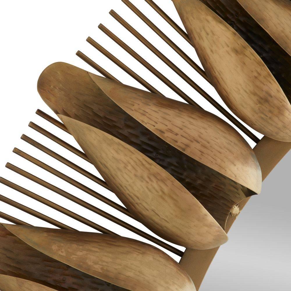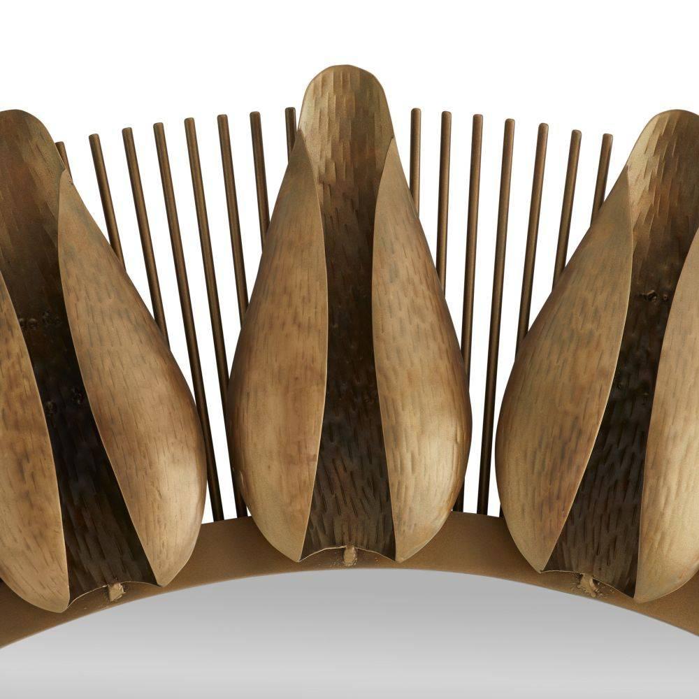 A mid-century style iron frame is updated with folded flower buds hammered and folded to resemble the petals of a lotus. Suspended on a sunburst ray, this energetic style is plated in antique brass. Secured at the back with a cleat attachment. Finish will vary.