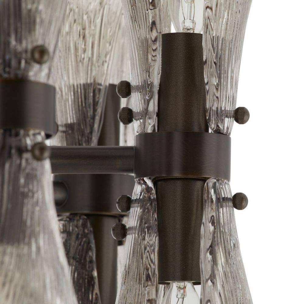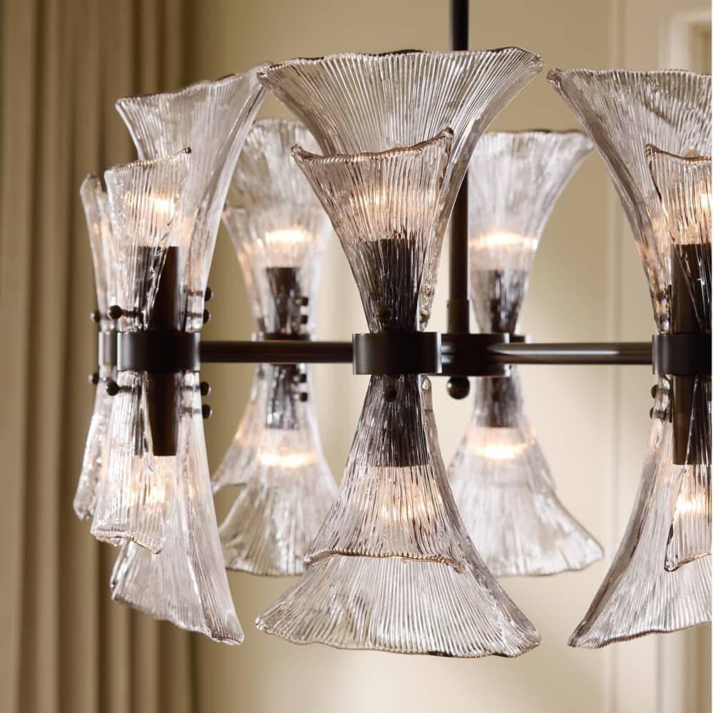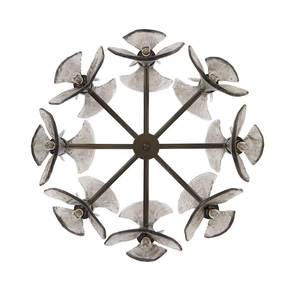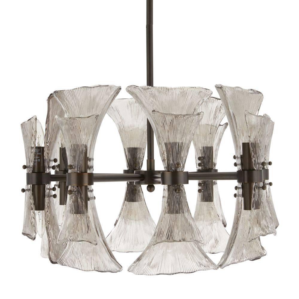 Art Nouveau jewelry's sinuous lines and natural motifs inform our smoke glass chandelier. Textured like ginkgo leaves, double glass shades blossom in a concentric circle from a mount of English bronze-plated steel. Made to cradle the light, its reinvented classic form is suspended from a matching pipe and canopy, making it a spectacular accent over a table. Damp-rated, although limited covered outdoor areas may affect finish.