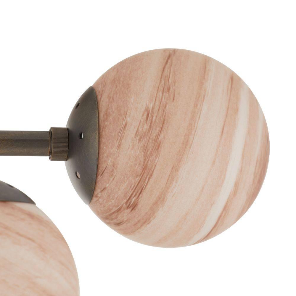 Nine starry orbs of new matte coffee swirl glass are suspended in a gridded frame of bronze-plated steel. This impactful style delivers a galaxy of light across the room. Anchored by a rectangular canopy for easy installation. Damp-rated, although limited covered outdoor areas may affect finish. Finish will vary.