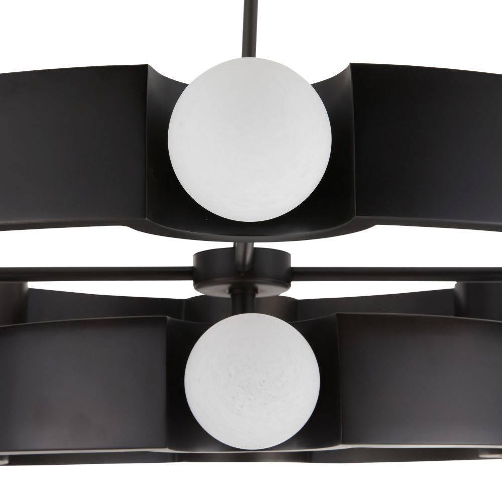 Our jewelry-inspired drum shade delivers a double dose of light. Reminiscing ribbons wrapping around pearls, globes of matte swirl glass are mounted on two English bronze-plated iron tiers suspended from a slim pipe. Twelve integrated LED bulbs. Damp-rated, although limited covered outdoor areas may affect finish.