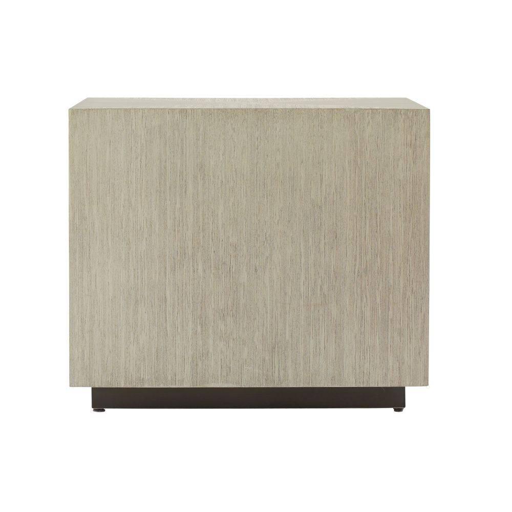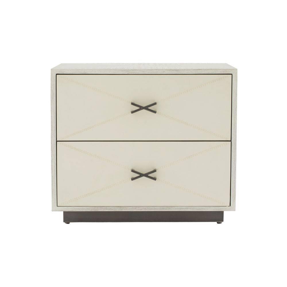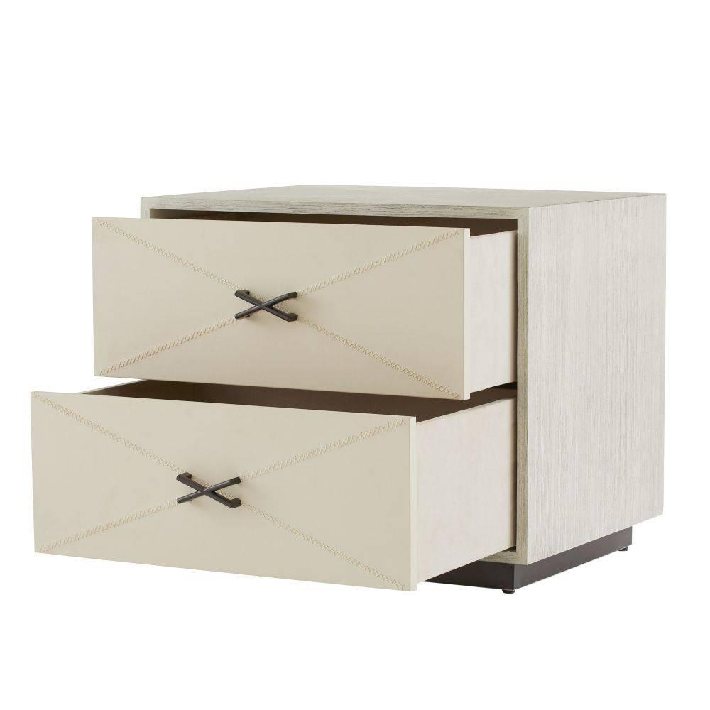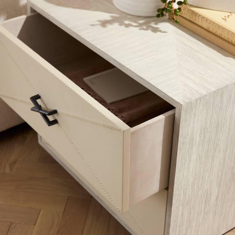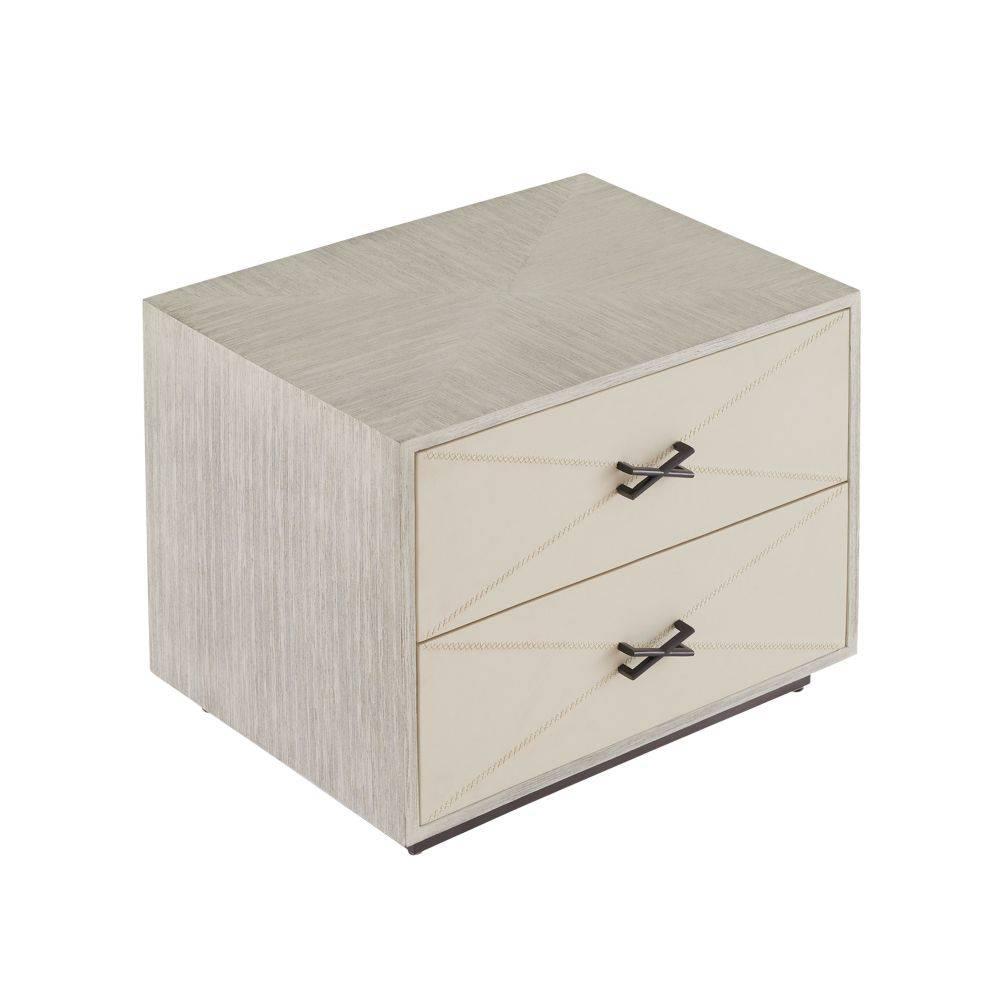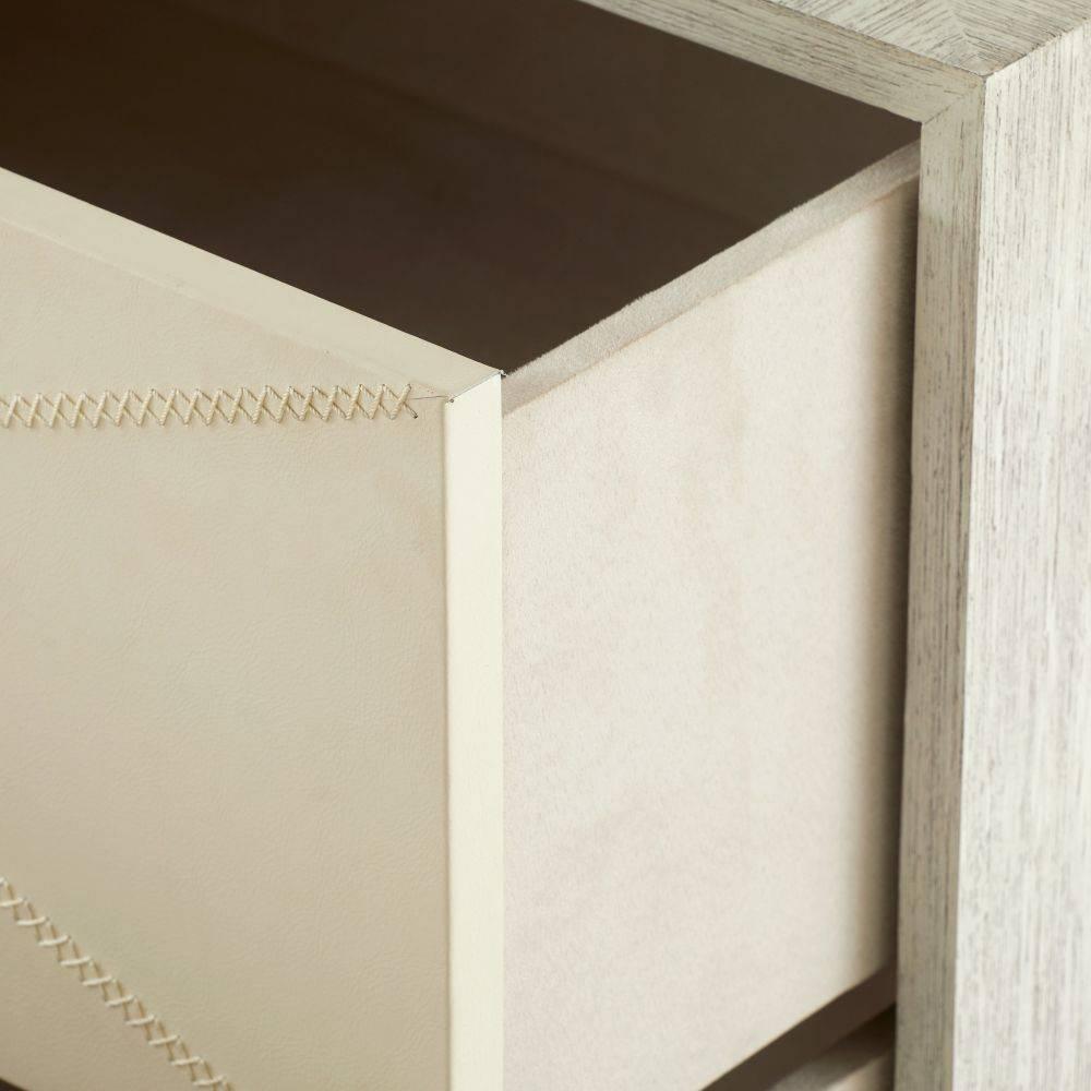 We borrowed whipstitch detailing from fine tailoring to adorn a side table of smoke oak wood. Each ivory leather-covered drawer is enhanced with cast brass hardware in English bronze finish to mirror the linear shape of the stitching. Designed with a generous depth for storage, this sophisticated piece is veneered all the way around, allowing it to float within the room. Soft-close drawers and English Bronze-plated stainless-steel base. Leather will vary.