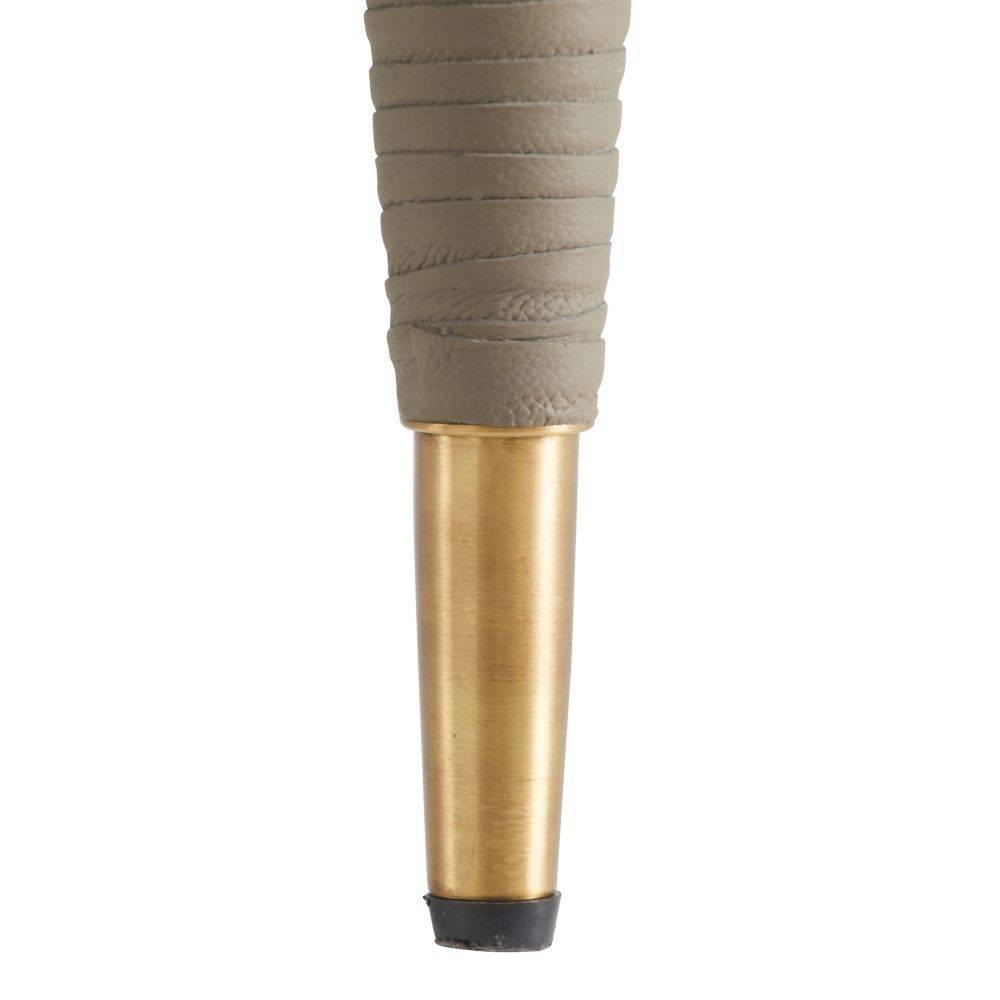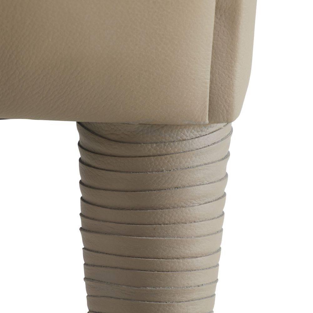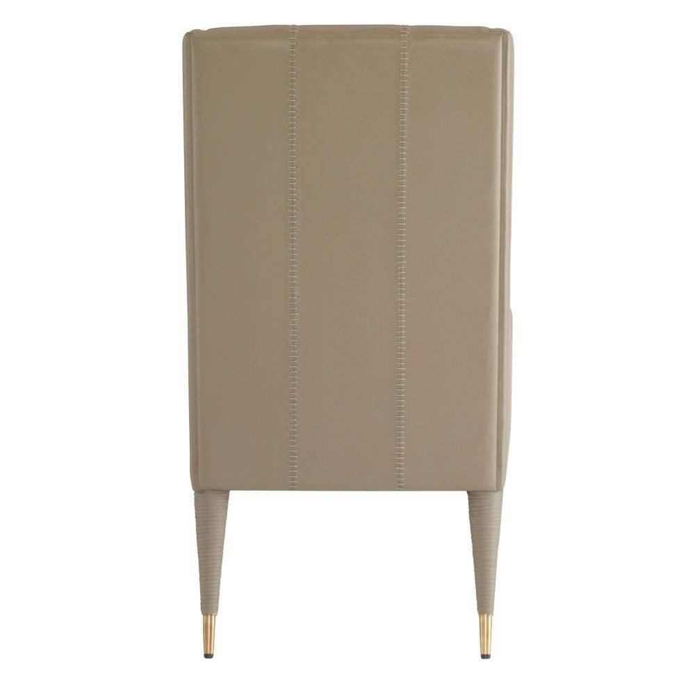 Racer stripe paneling and topstitching define the wing-backed Hawthorne. Covered in rich dove leather, it is perfectly scaled for a host/hostess chair or desk. Each exaggerated tapered leg is wrapped in leather cord and tipped with a polished antique brass-plated ferrule. Stitching continues at the back so this piece can float within the room. Leather will vary.