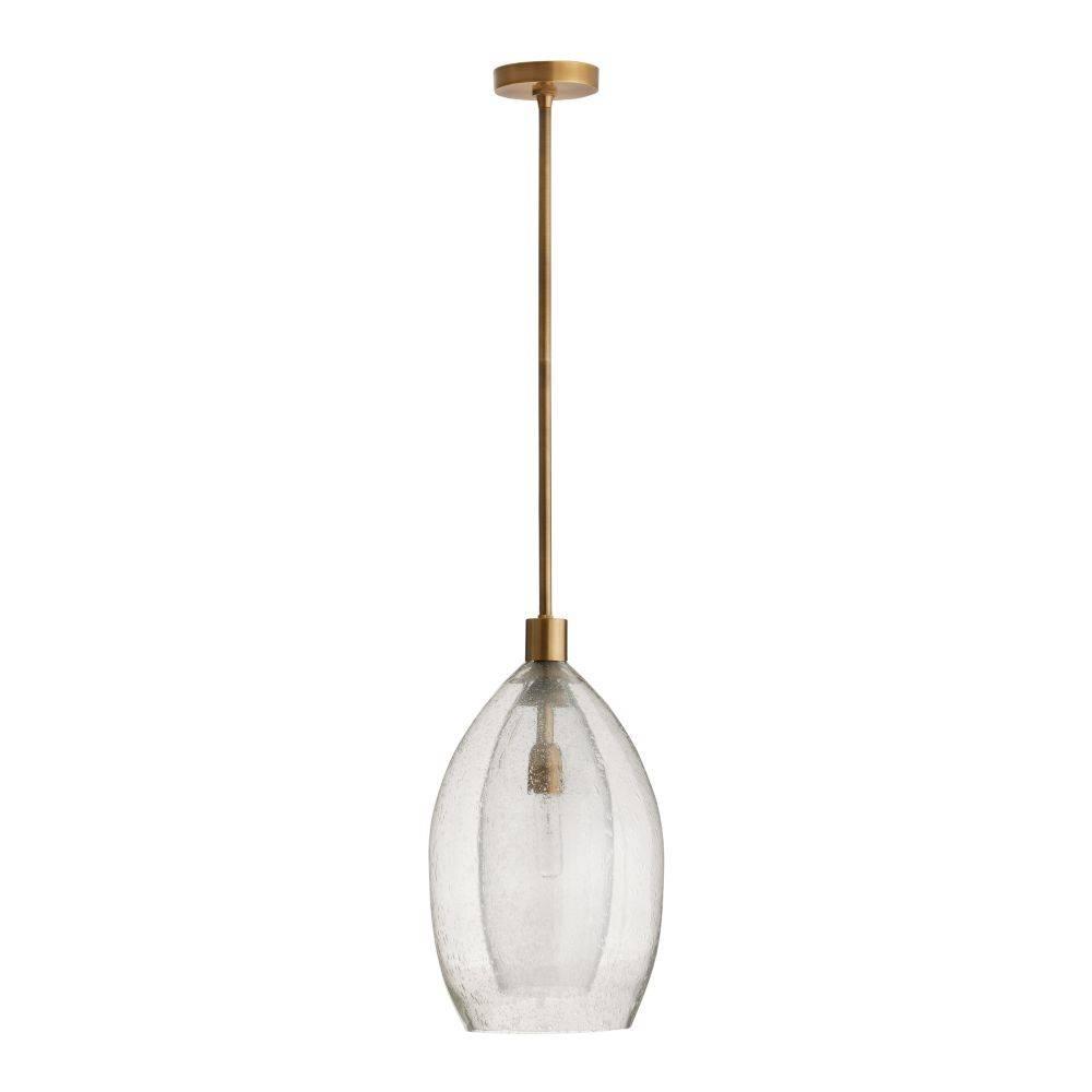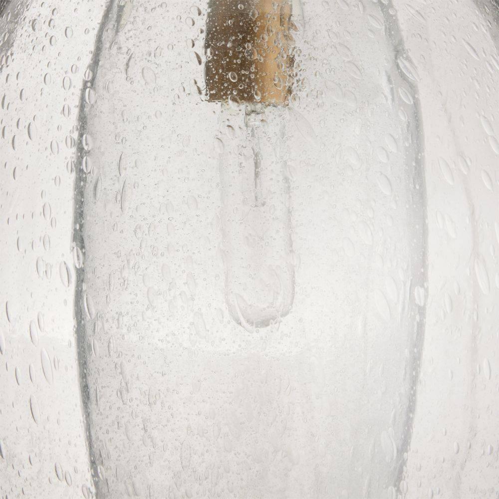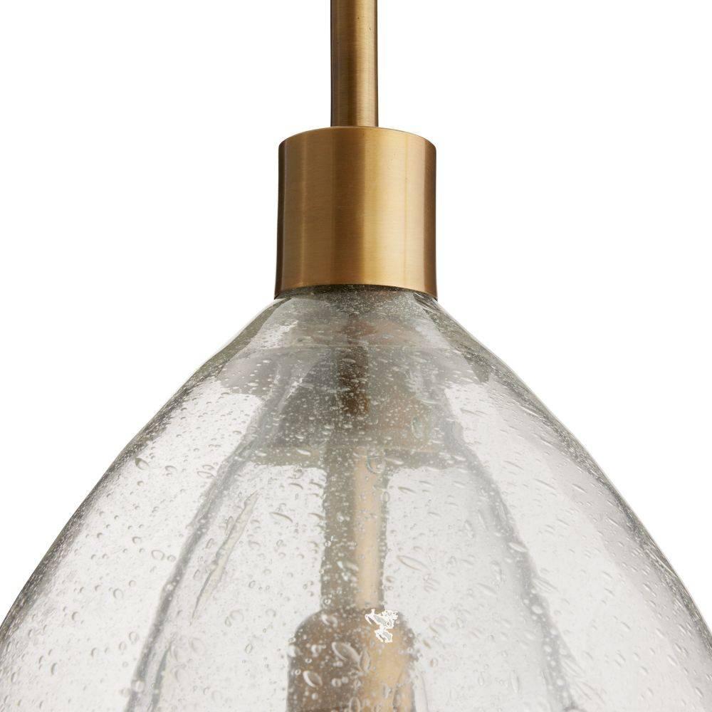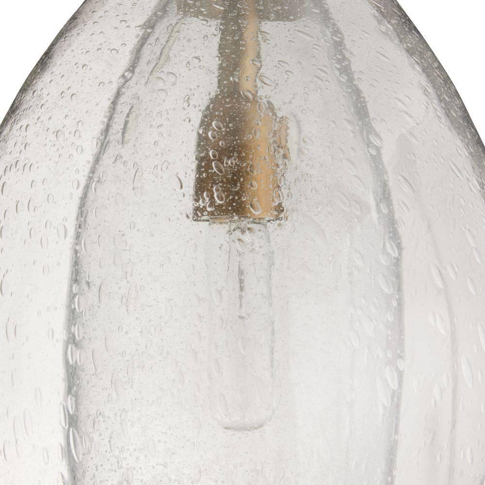 A teardrop-shaped glass pendant plays with translucency and layering to stunning effect. Double clear seedy glass nest inside one another, anchored to a vintage brass-plated iron pipe and canopy. The resulting glow makes it even more impactful when installed in multiples over a bar or counter. Damp-rated, although limited covered outdoor areas may affect finish.
