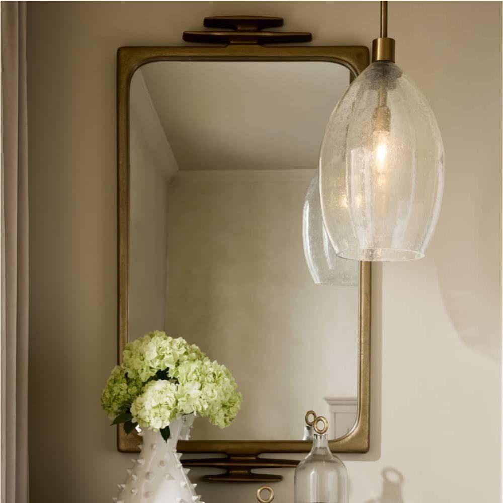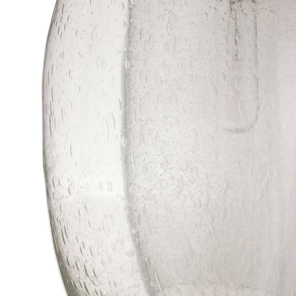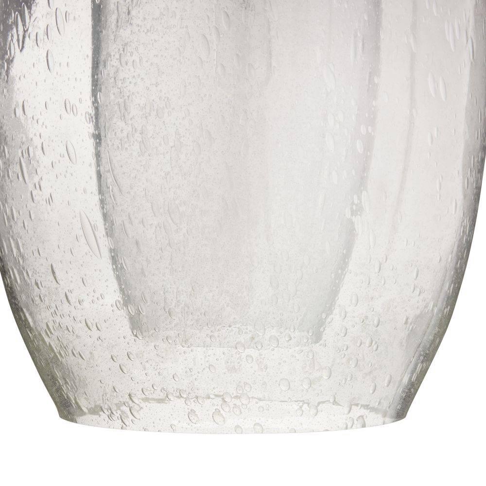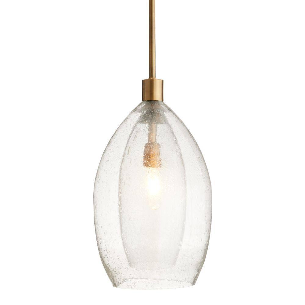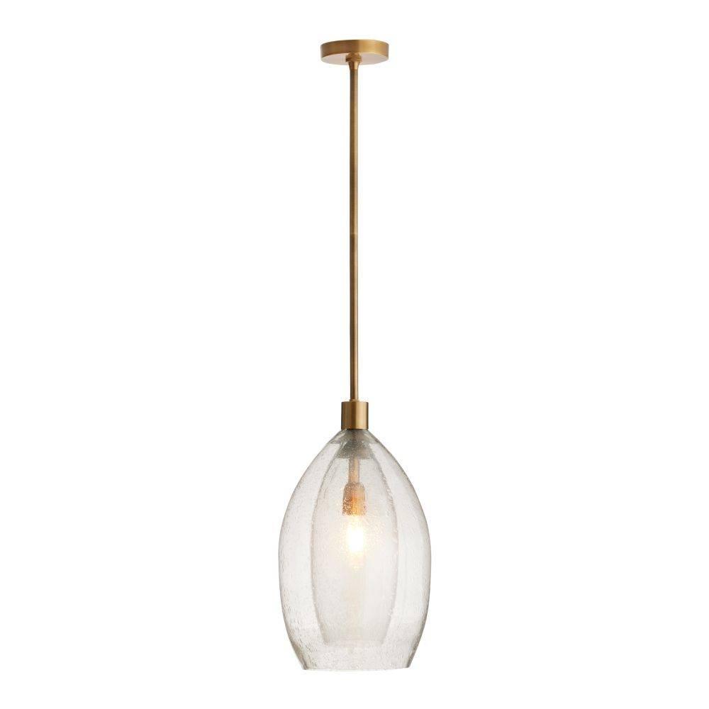 A teardrop-shaped glass pendant plays with translucency and layering to stunning effect. Double clear seedy glass nest inside one another, anchored to a vintage brass-plated iron pipe and canopy. The resulting glow makes it even more impactful when installed in multiples over a bar or counter. Damp-rated, although limited covered outdoor areas may affect finish.