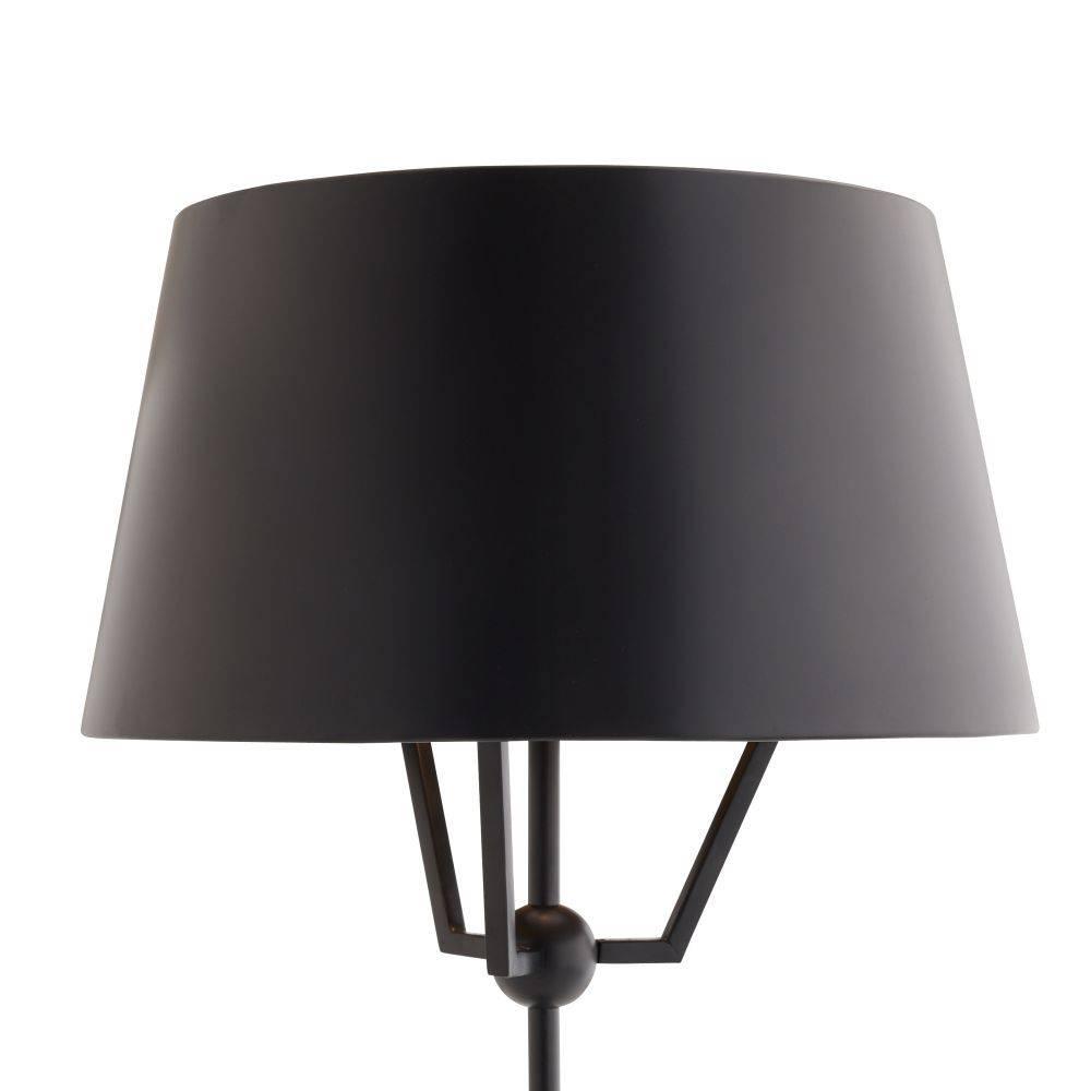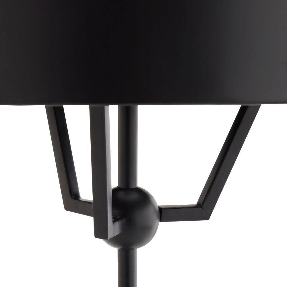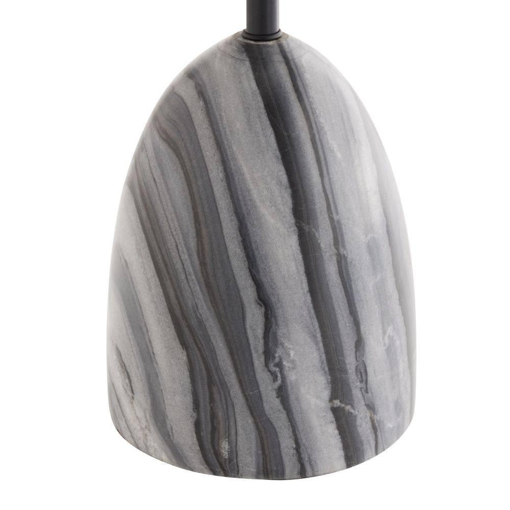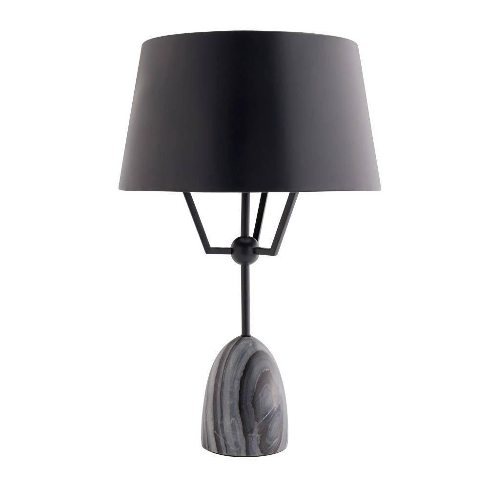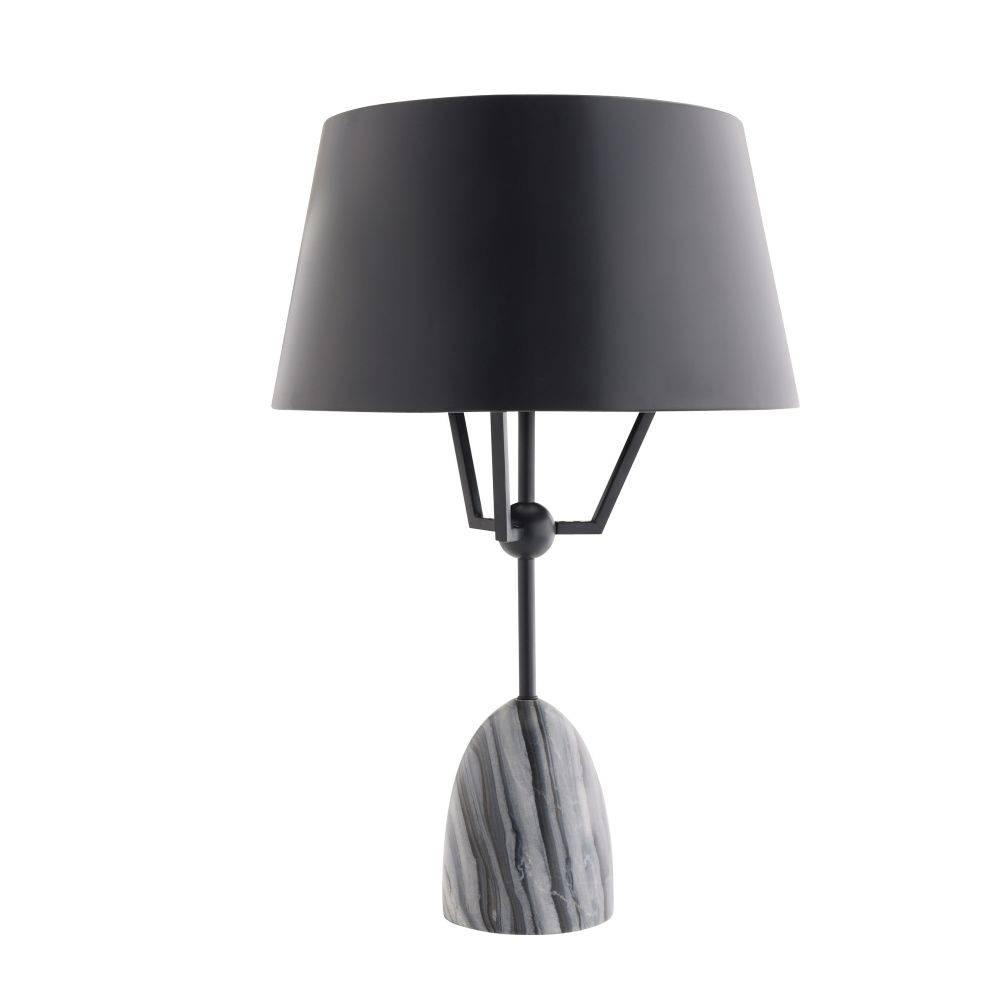 Like a figure holding up its arms, this playful style of bronze-plated iron seemingly "lifts" its sleek metal shade to disperse light. A rounded base of galaxy marble juxtaposes the fixture's industrial edge. Matching finial. Finish will vary.
