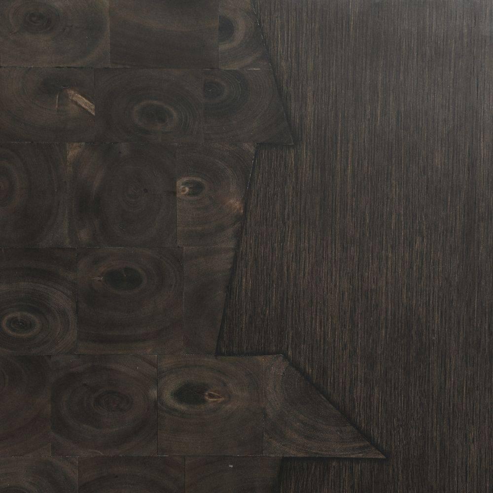 Utilizing a technique that dates to 17th-century Europe, the Hudson is finished with carefully applied natural oyster veneer from oak wood parquetry across the front of a sable oak veneer frame. Chamfered at the top frame and finger pulls, it is finished with a recessed top and angular plinth antique brass base. The single adjustable shelf makes it a versatile cabinet for any home. Oyster will vary.
