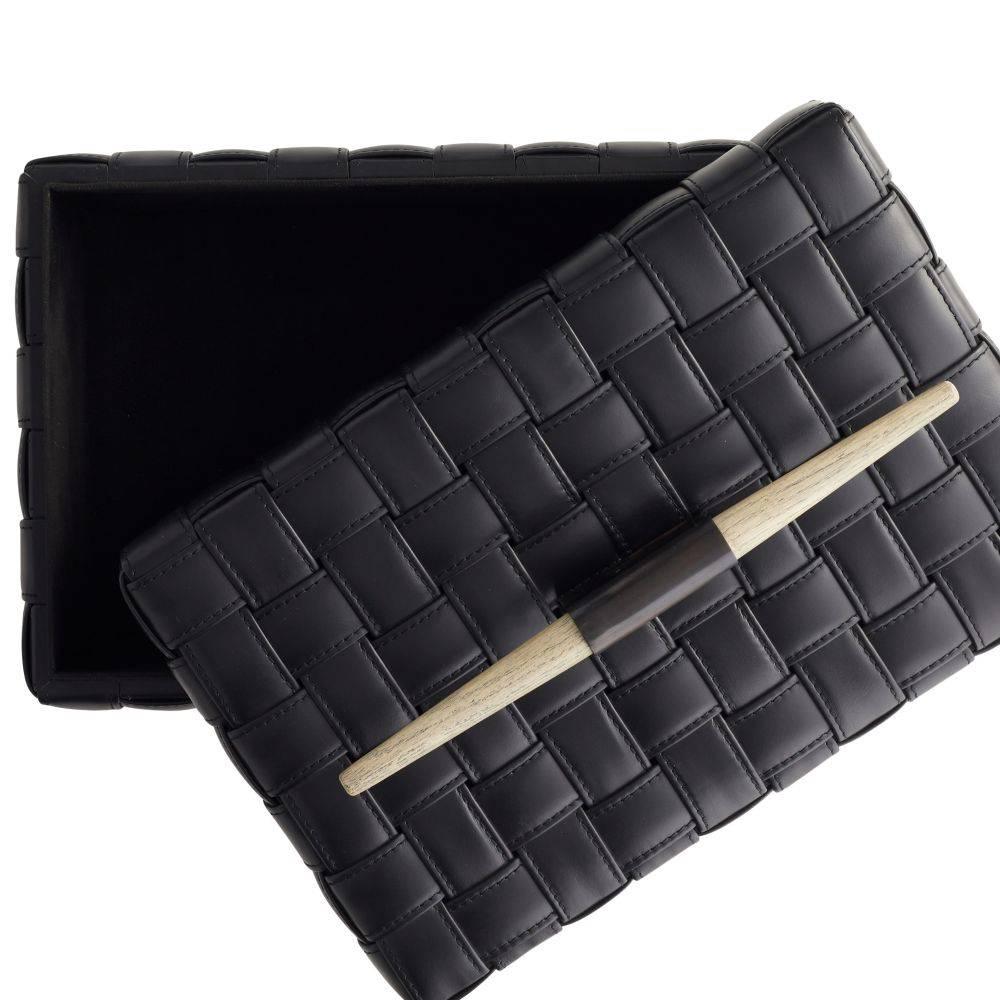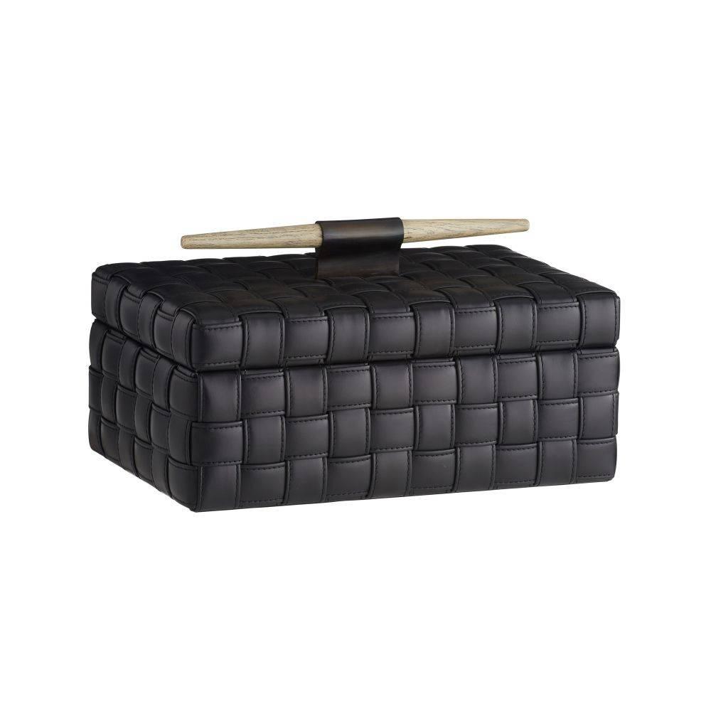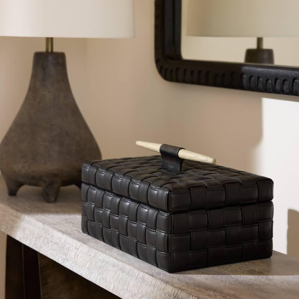 Our Humphrey Box is wrapped in a basketweave pattern of topstitched black leather. Accented with a spear-shaped handle of bronze-plated iron and smoke finished beechwood, it lends a masculine accent to a desk or tabletop. Finish will vary.