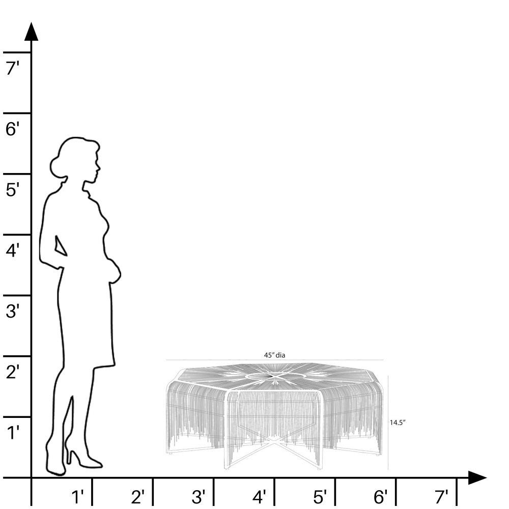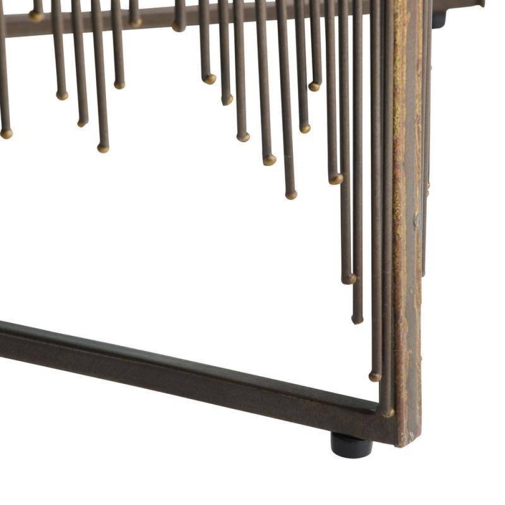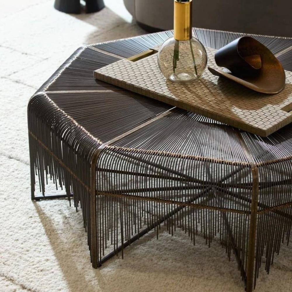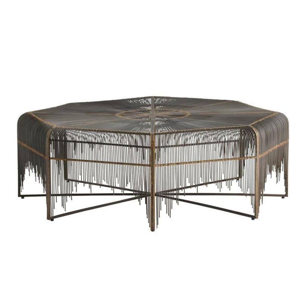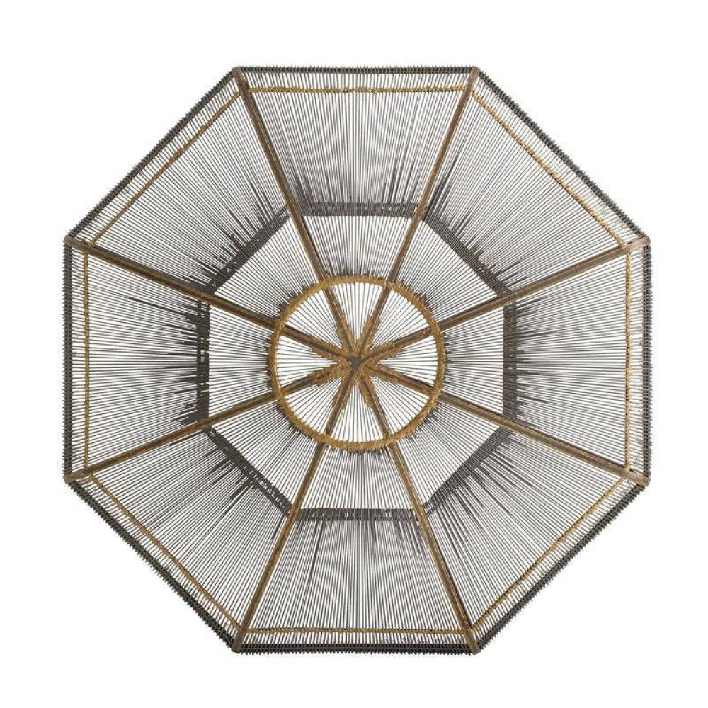 The distinctive lines of Brazilian mid-century modern design influenced the intricate construction of our octagonal table. Delicate pipes of natural iron are joined with antique brass welds in an alluring starburst motif, making this piece a stunner from every angle. Each leg has an iron foot for secure placement. Finish will vary.