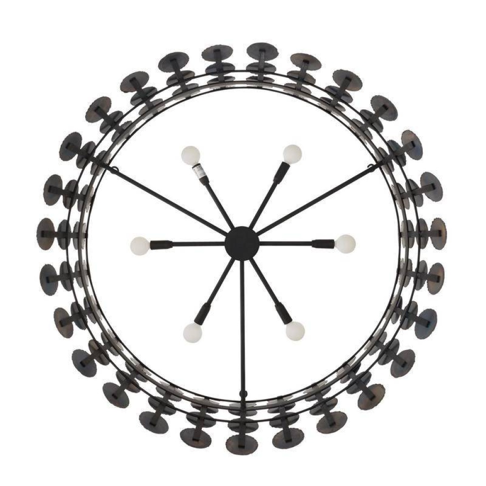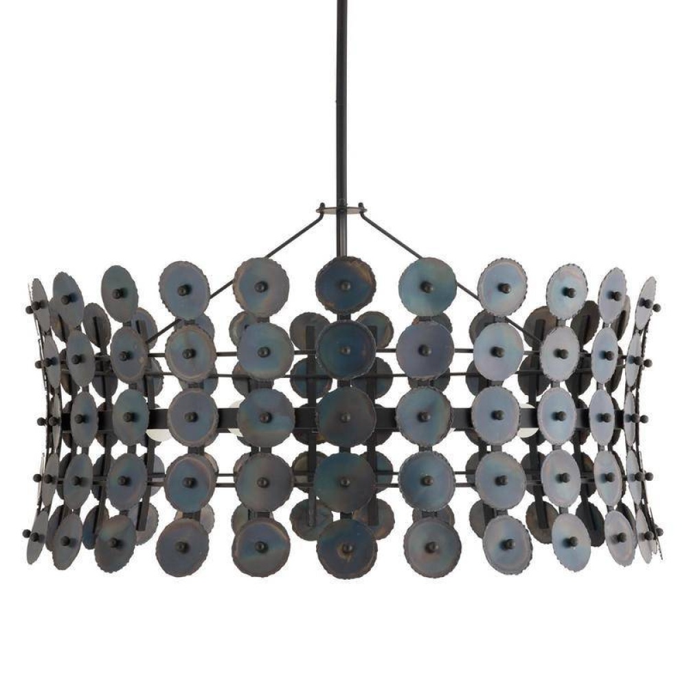 The rhythmic repetition of circles adds pleasing symmetry to a fixture of burnt iron. Hung from a matching iron pipe, the hourglass shape is enhanced with hand-torched details that add a subtle gradation effect. Damp-rated, although limited covered outdoor conditions may affect finish. Finish will vary.