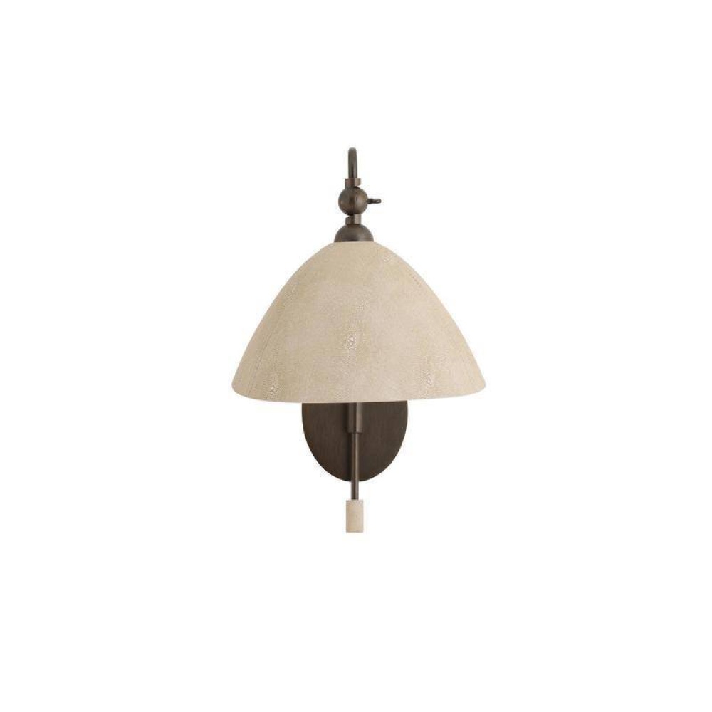 Faux shagreen embossed leather is carefully shaped and stitched to form the rounded shade of the Inlet sconce. The adjustable shade hangs from a linear arm of English bronze-plated steel designed to be swung from left to right for the ideal amount of light. Finish will vary. Damp-rated, although limited, covered outdoor conditions may affect finish.
