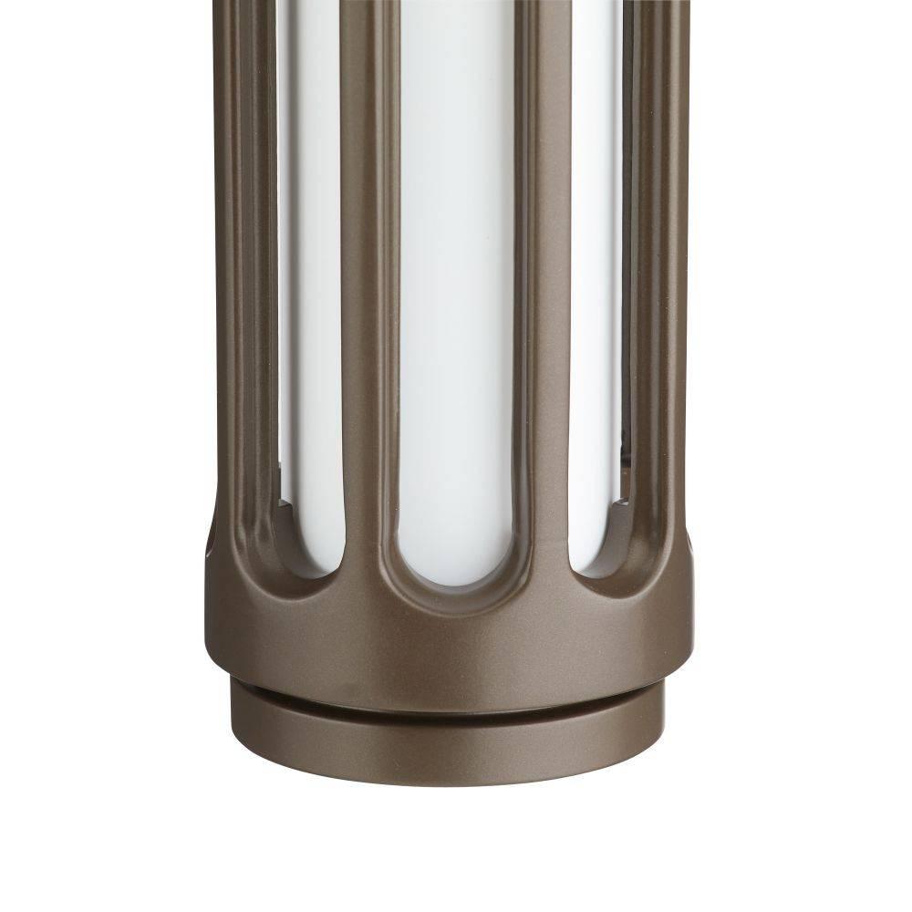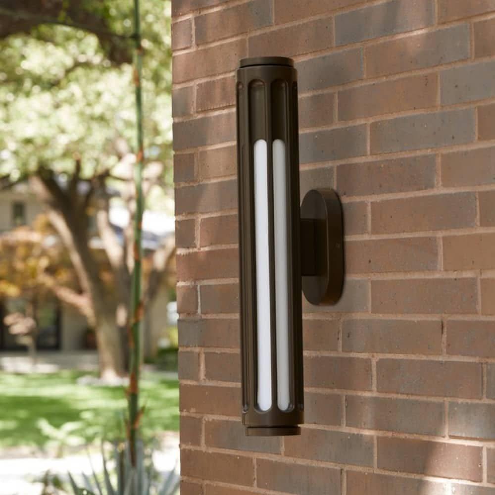 The Inset outdoor sconce’s fluted column shape features a series of carved channels, filled with linear frosted glass lights, a subtle play on positive and negative space. Marine grade aged english bronze steel and frosted soft light, Inset creates intrigue and visual interest in exterior spaces. A protective coating helps withstand the elements.