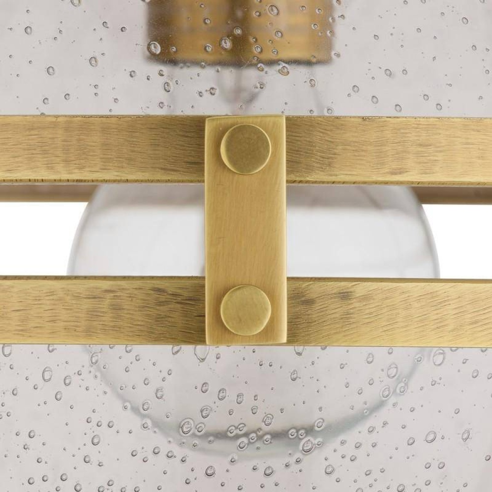 A globe of smoke seedy glass is an updated twist on neo-classical design. Clasped in a framework of antique brass-plated steel, the globe surrounds a floating circle of chattered antique brass that seemingly floats within its waterline design. Subtle bubbles add texture to the finish, and a tiered brass accent adorns the center. Finish will vary. Damp-rated, although limited covered outdoor conditions may affect finish.