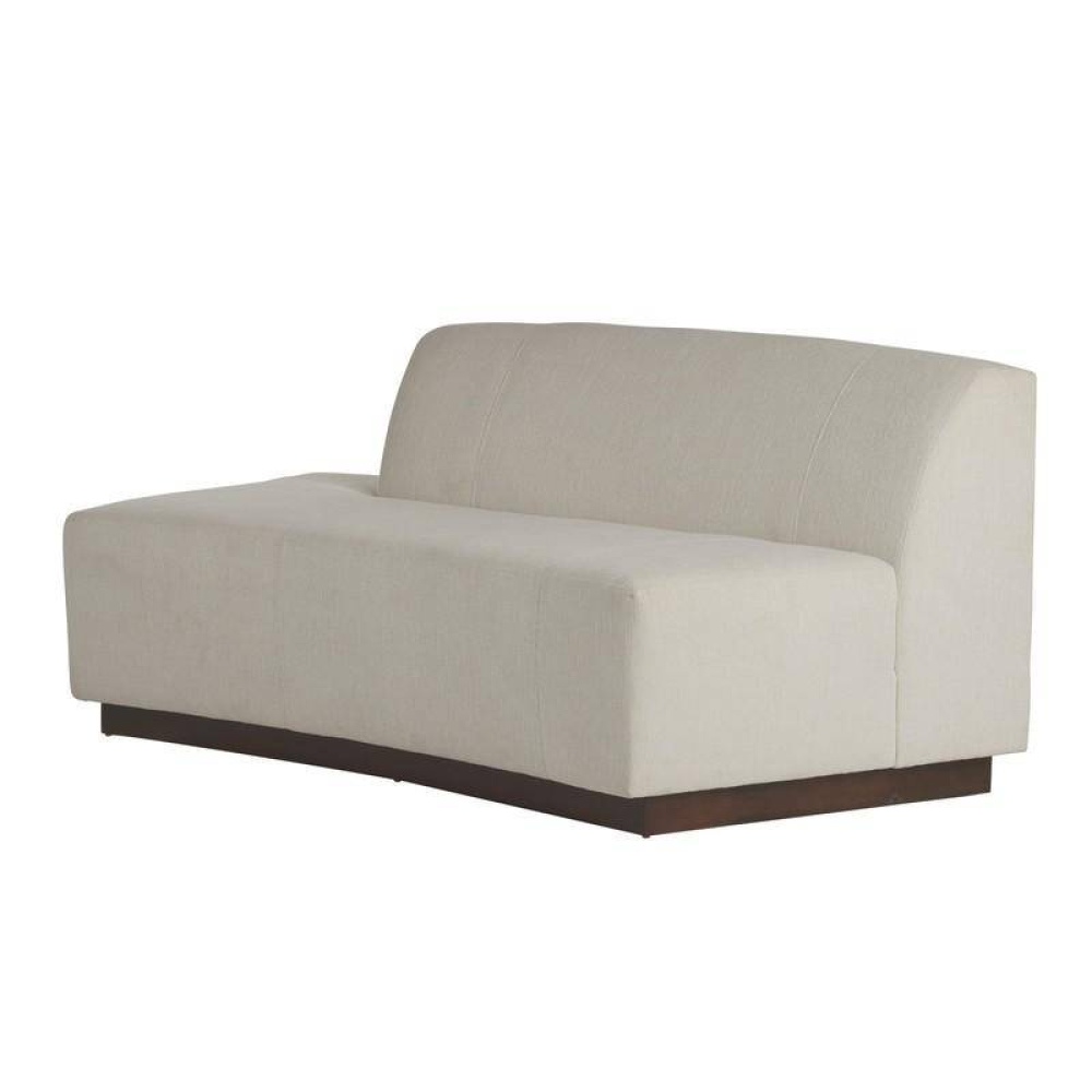 The serpentine form of the Islander recalls the curves of mid-century modern architecture. Suspended on a plinth of dark walnut maple wood, the plush seat and notched offset back are upholstered in a vanilla performance bouclé. Designed to deliver elegance and versatility, this style can be staged as one long sofa with its right-facing companion or split with an accent or coffee table.