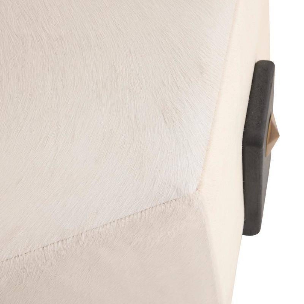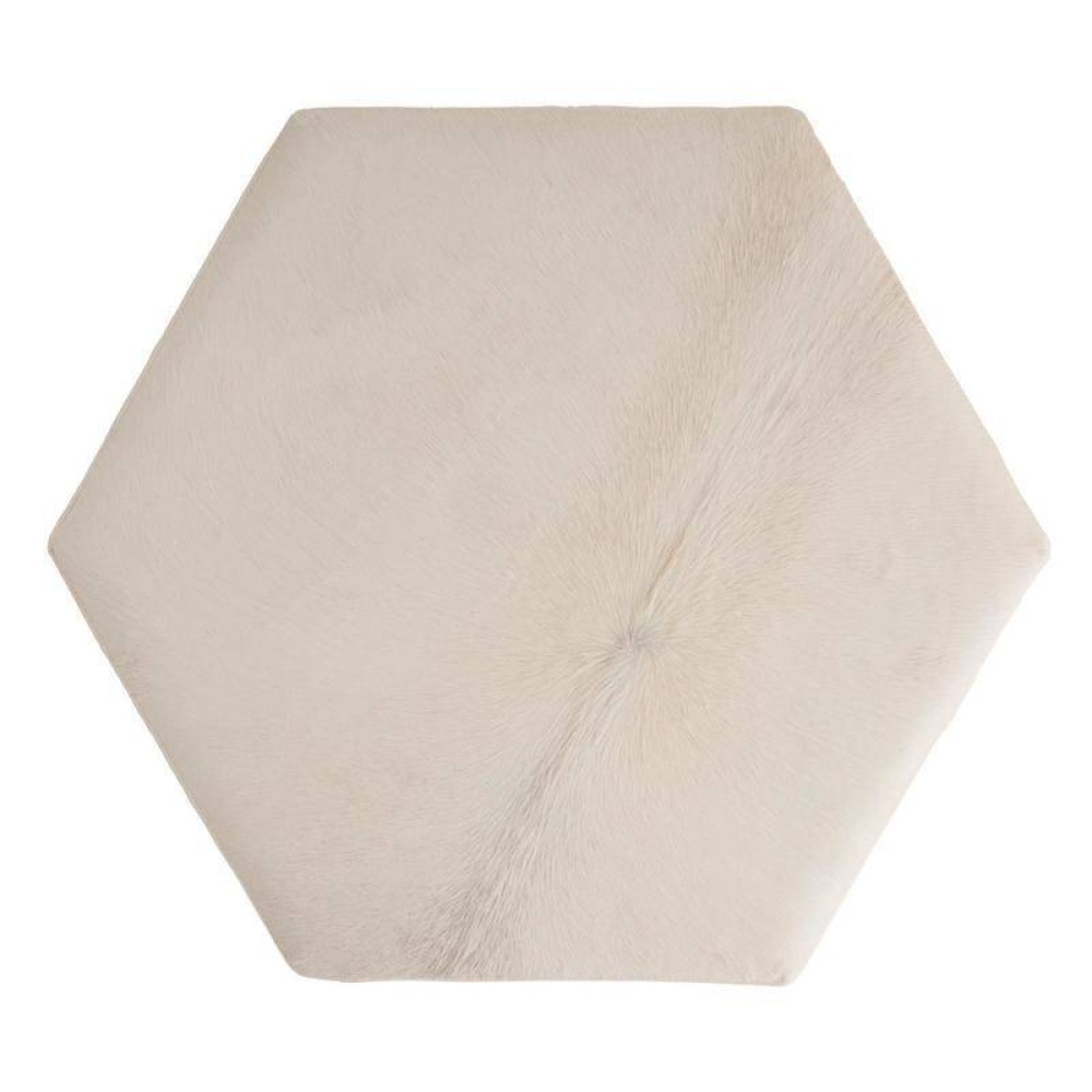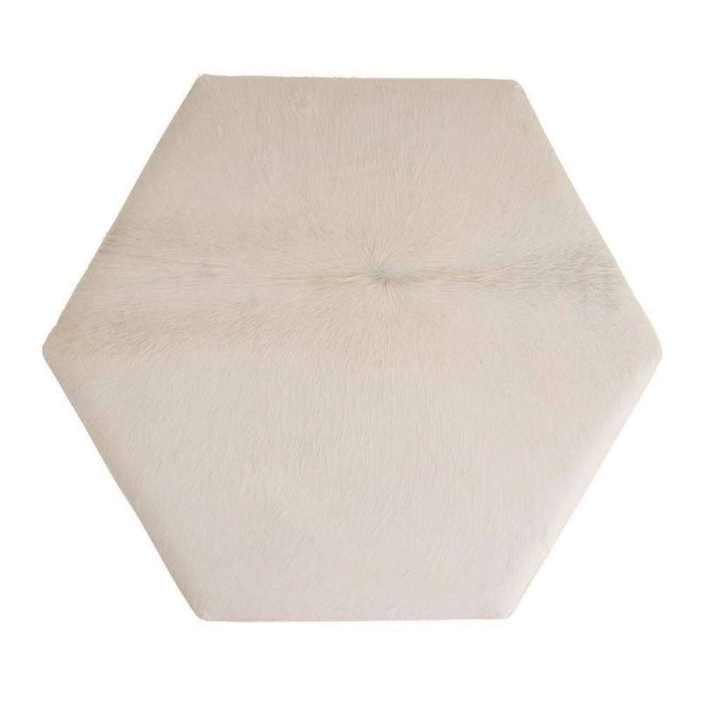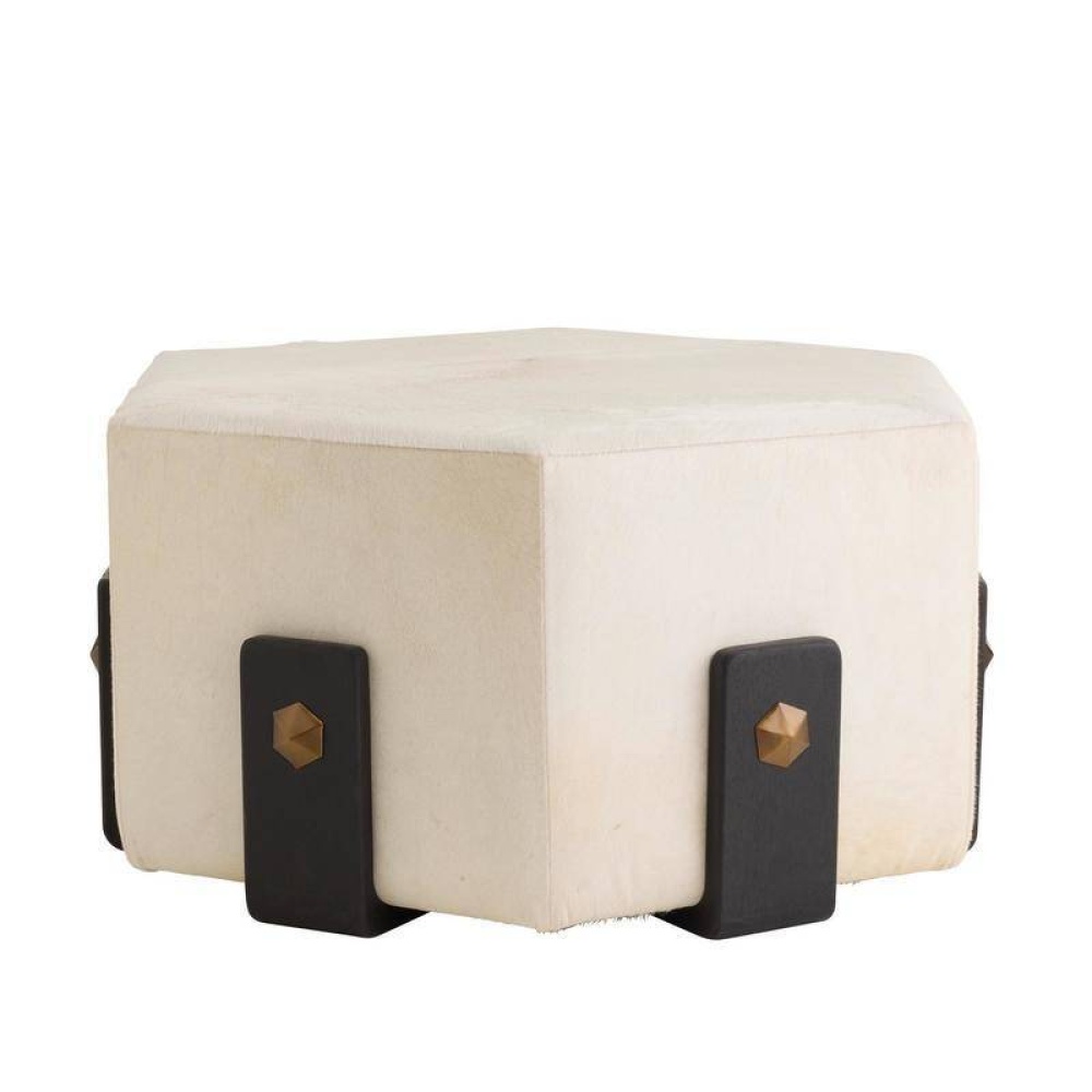 Crafted of sumptuous white hair on hide, a hexagonal ottoman makes a sophisticated addition to any cocktail seating arrangement. Bracketed by clasps of ebony mango wood accented with antique brass hardware, each piece is unique, as the spine of the hide will never fall in the same place twice. Finish will vary.