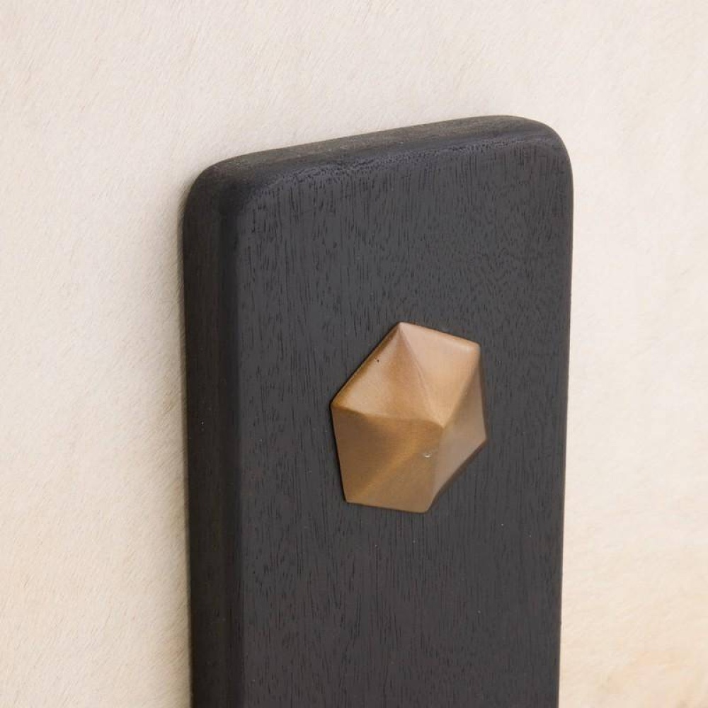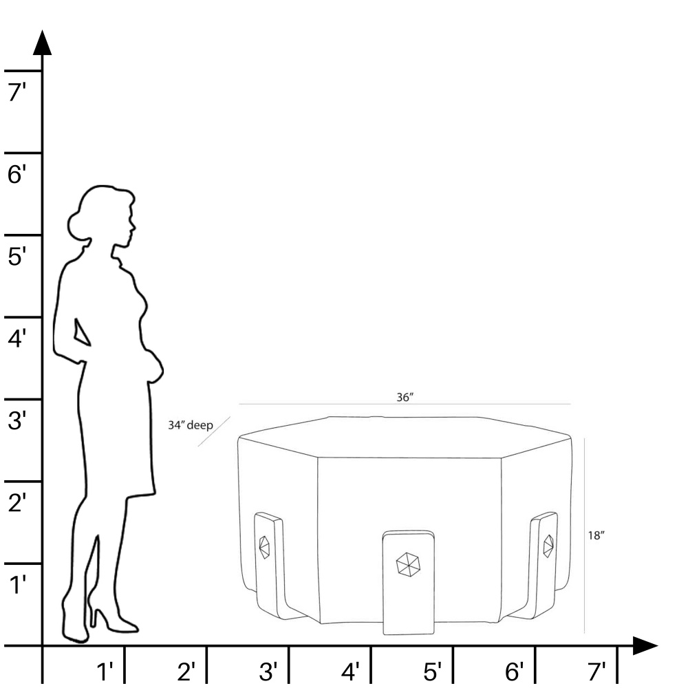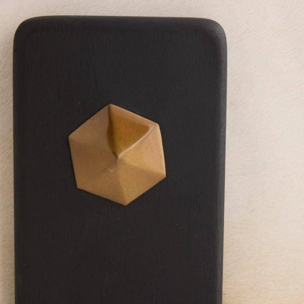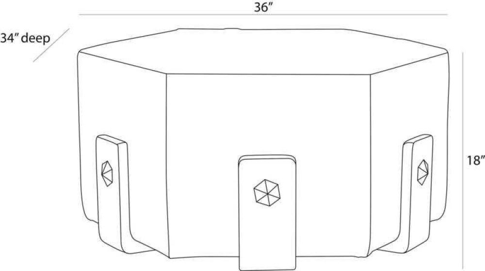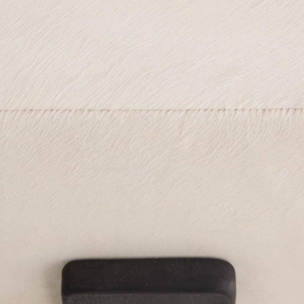 Crafted of sumptuous white hair on hide, a hexagonal ottoman makes a sophisticated addition to any cocktail seating arrangement. Bracketed by clasps of ebony mango wood accented with antique brass hardware, each piece is unique, as the spine of the hide will never fall in the same place twice. Finish will vary.