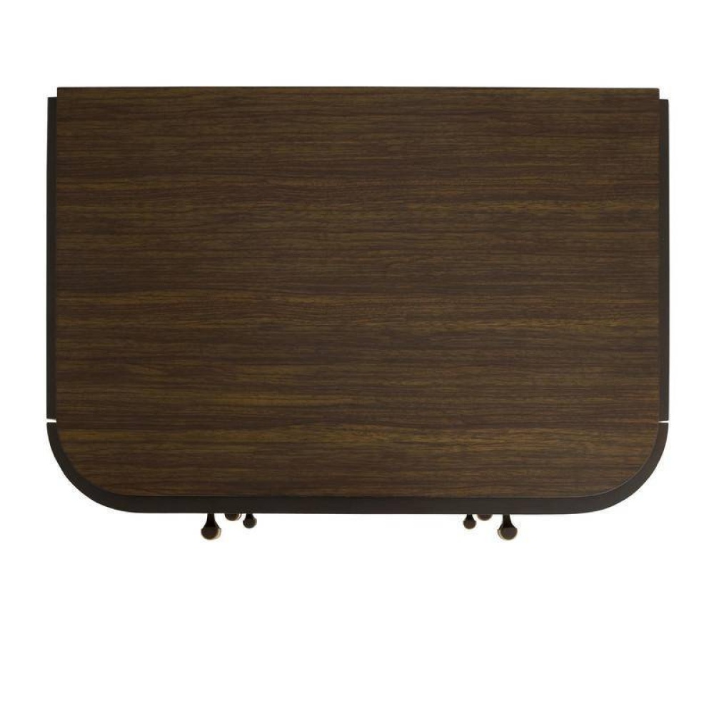 We reinvented the stacked campaign-style side table in brindle ofram wood with rotated layout veneer that creates different patterns to catch the eye. Three soft-close drawers are accented with bespoke bronze stainless steel trim along the reveal and natural faux horn resin pulls. This capacious style is impactful on its own or staged with the matching Jacques chest. Finish will vary.