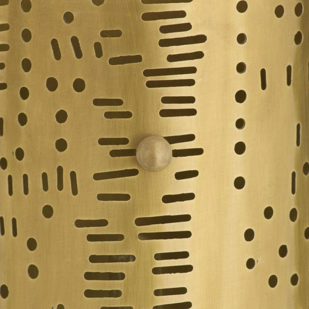 A laser-cut sconce of antique brass is delicately pierced in a pattern that recalls tribal pottery. Designed to allow light to cast shadows across the surface, this enigmatic style holds two bulbs. Finish will vary. Damp-rated, although limited, covered outdoor conditions may affect finish.
