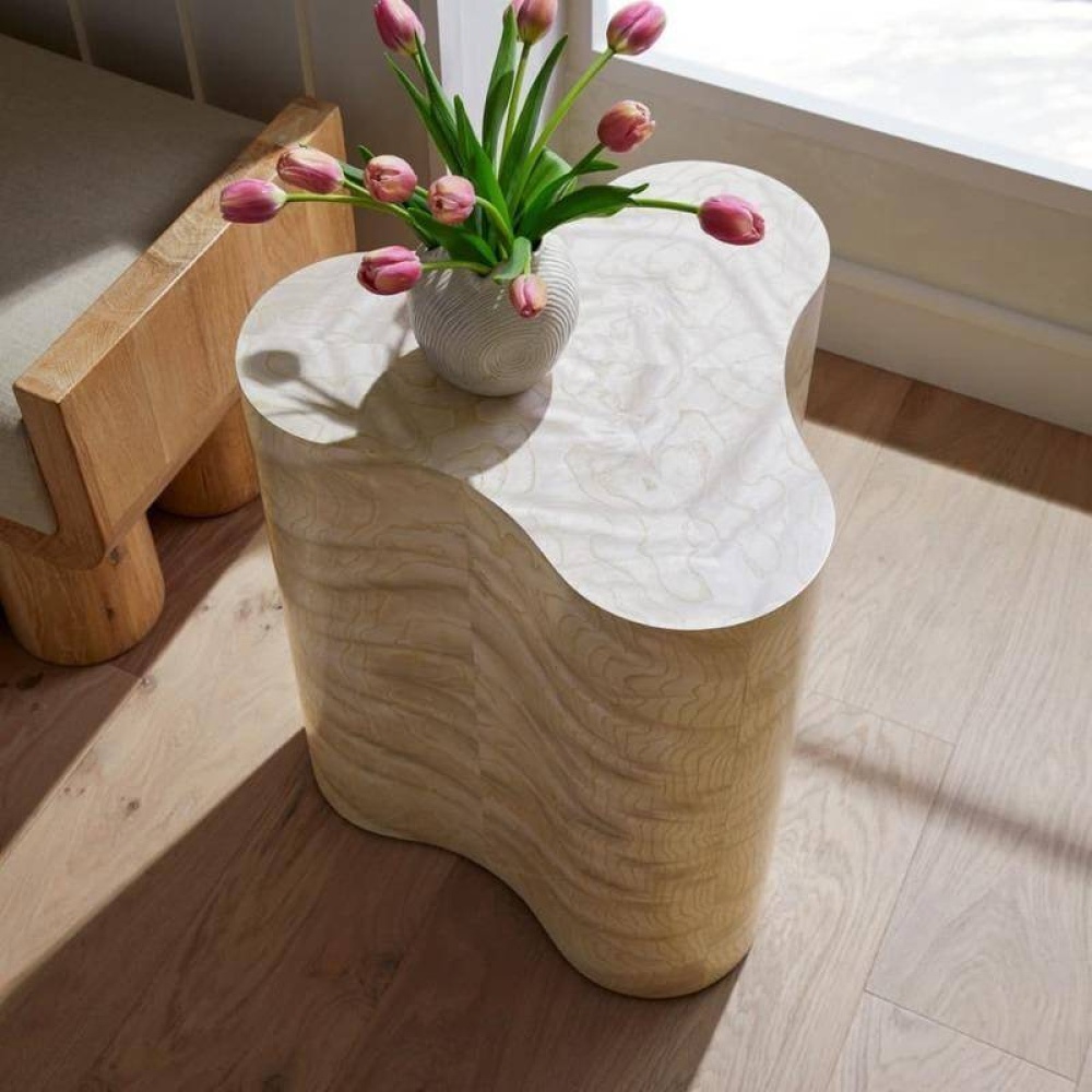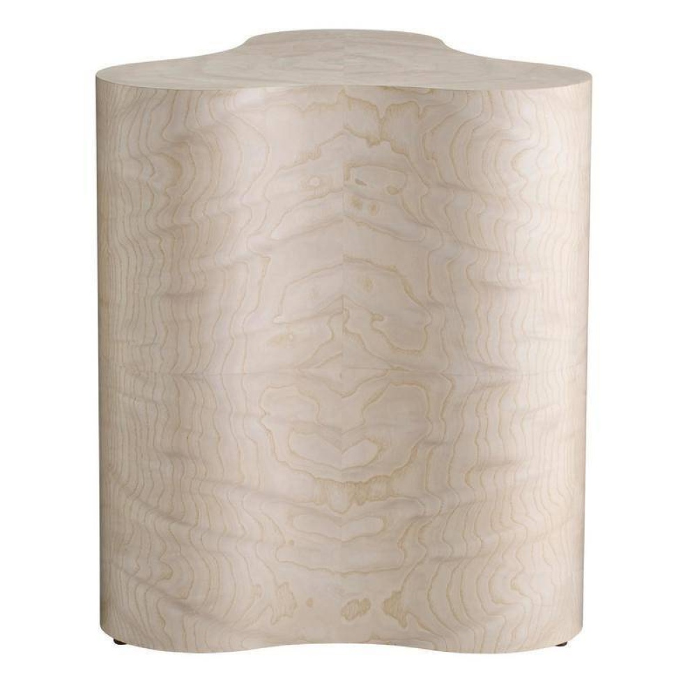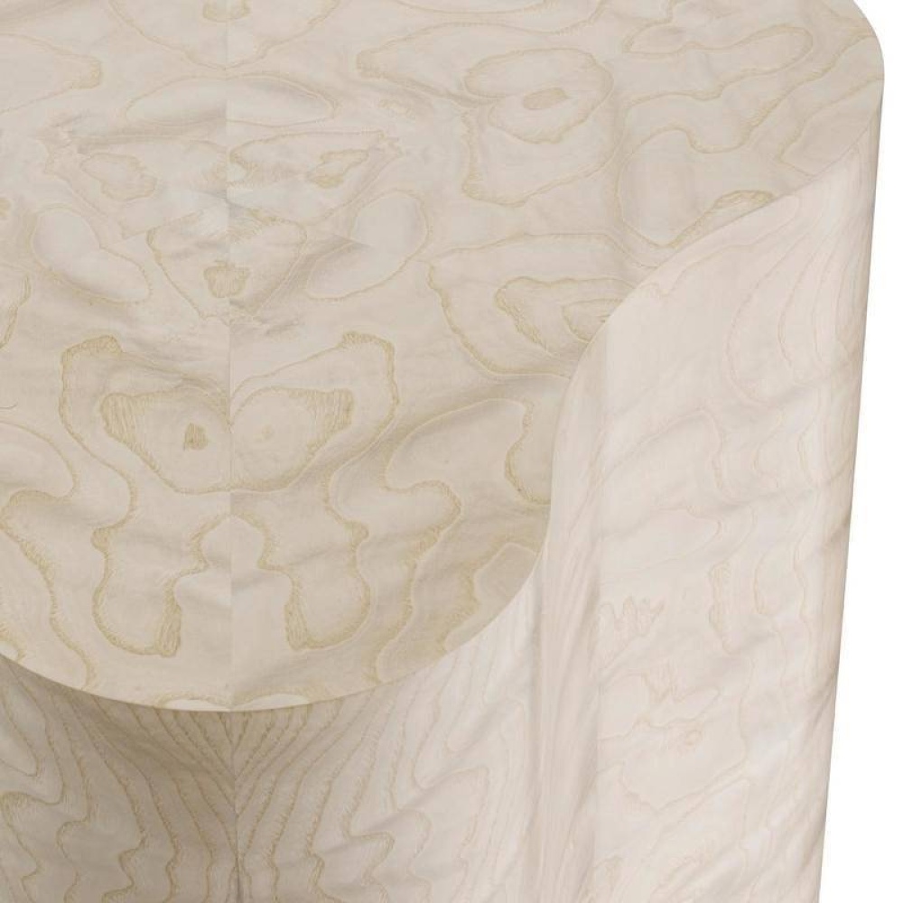 A simple extruded pedestal is crafted in a trefoil-inspired form to offer as much surface as possible without taking up a lot of space. It is finished in light beige burl ash veneer that is book-matched for a seamless appearance. Finish will vary.