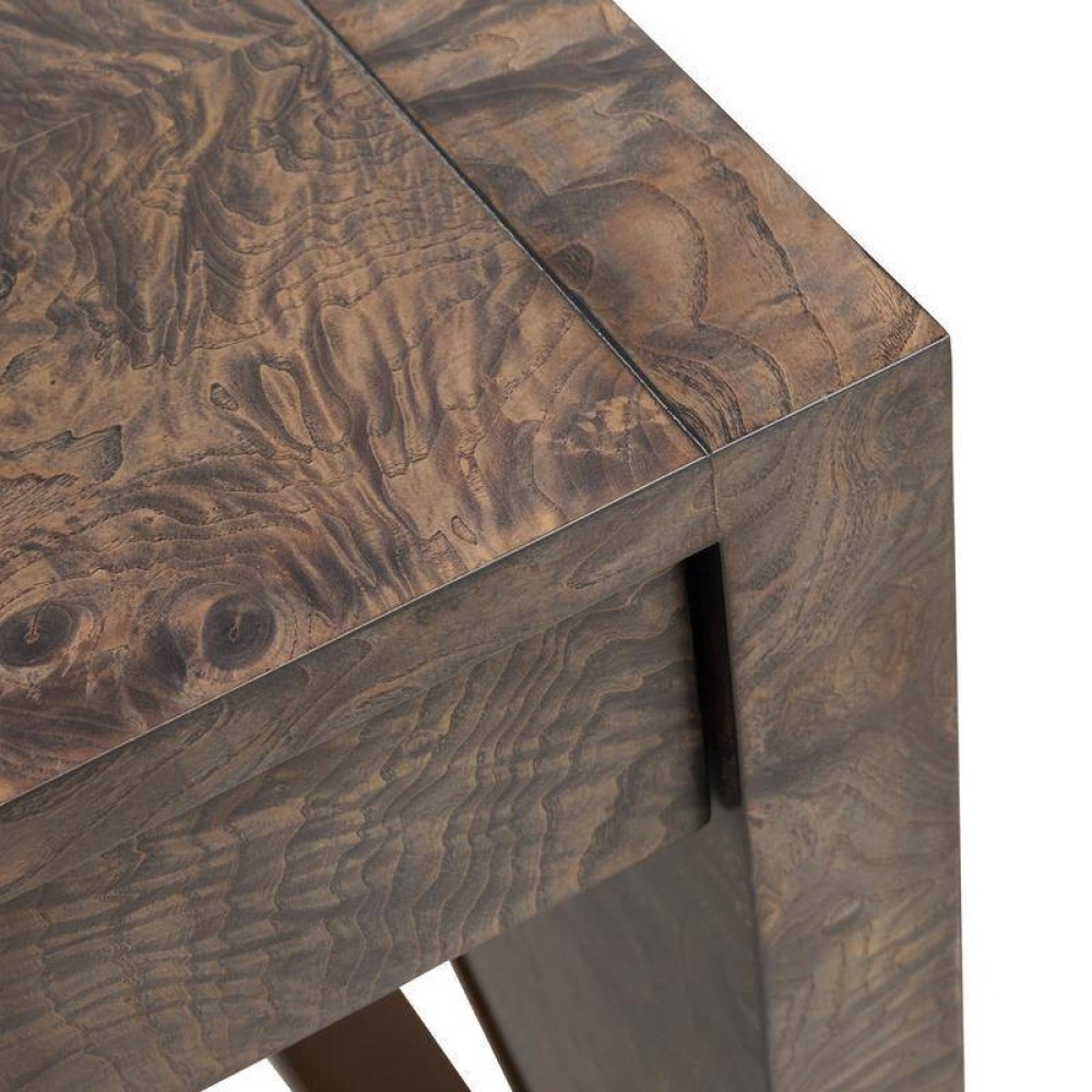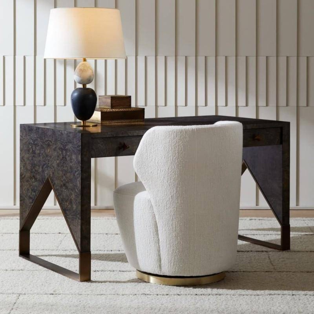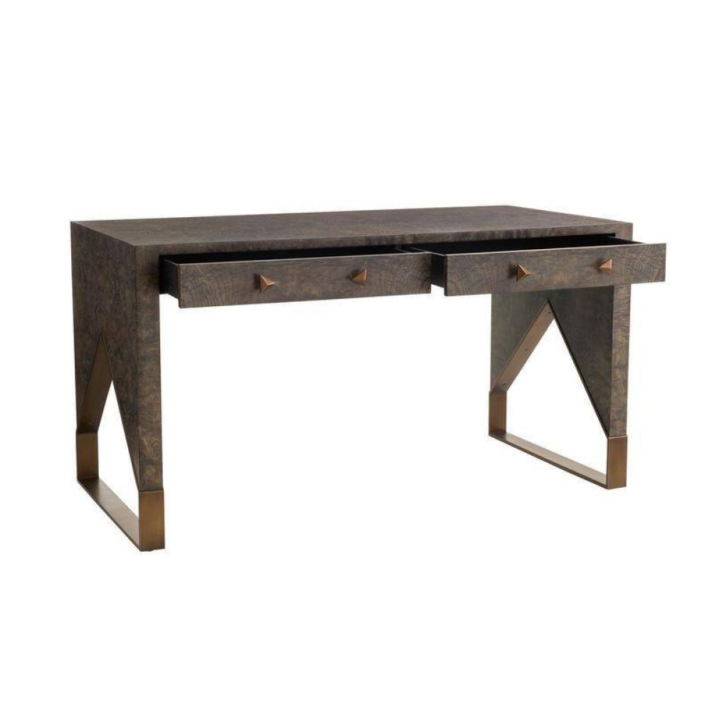 A sled-legged desk of olive ash veneer was finished front and back in truffle burl, allowing it to float within the room. The peak of each antique brass-tipped sled leg is carefully fitted to match the case for a seamless silhouette. Double pencil drawers adorned with triangular stud hardware were designed to close softly. Finish will vary.