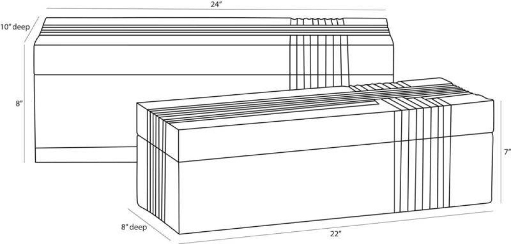 Dual oversized containers of whitewash mango wood make an elegant storage solution. Carved linework cascades in a flowing effect over the sides to draw the eye to this neutral accessory. Hinge and chain interior closure. Finish will vary.