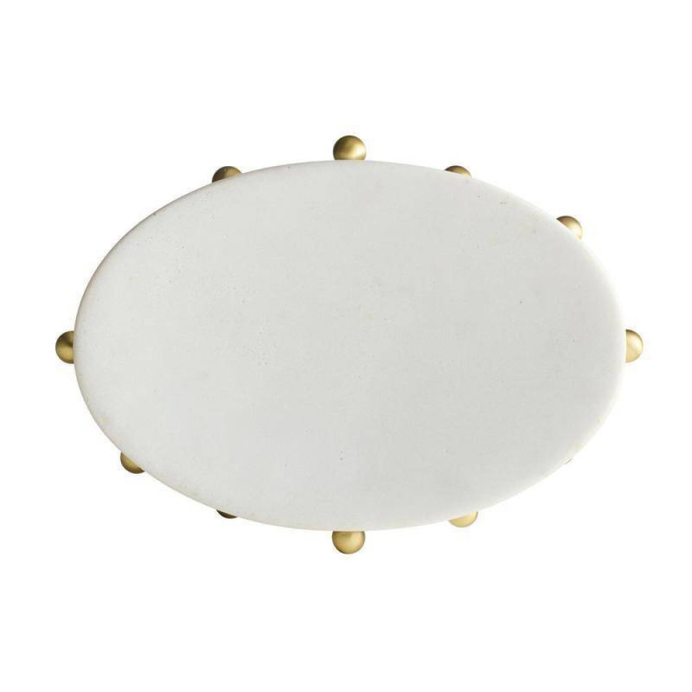 We studded the surface of the bowl-shaped centerpiece with accents of antique brass steel. Cast of ivory ricestone composite, Katherine possesses a playful appeal informed by the graphic mod movement of the 1960s. The brass "dots" also serve as feet to elevate the centerpiece off the tabletop. Finish will vary.