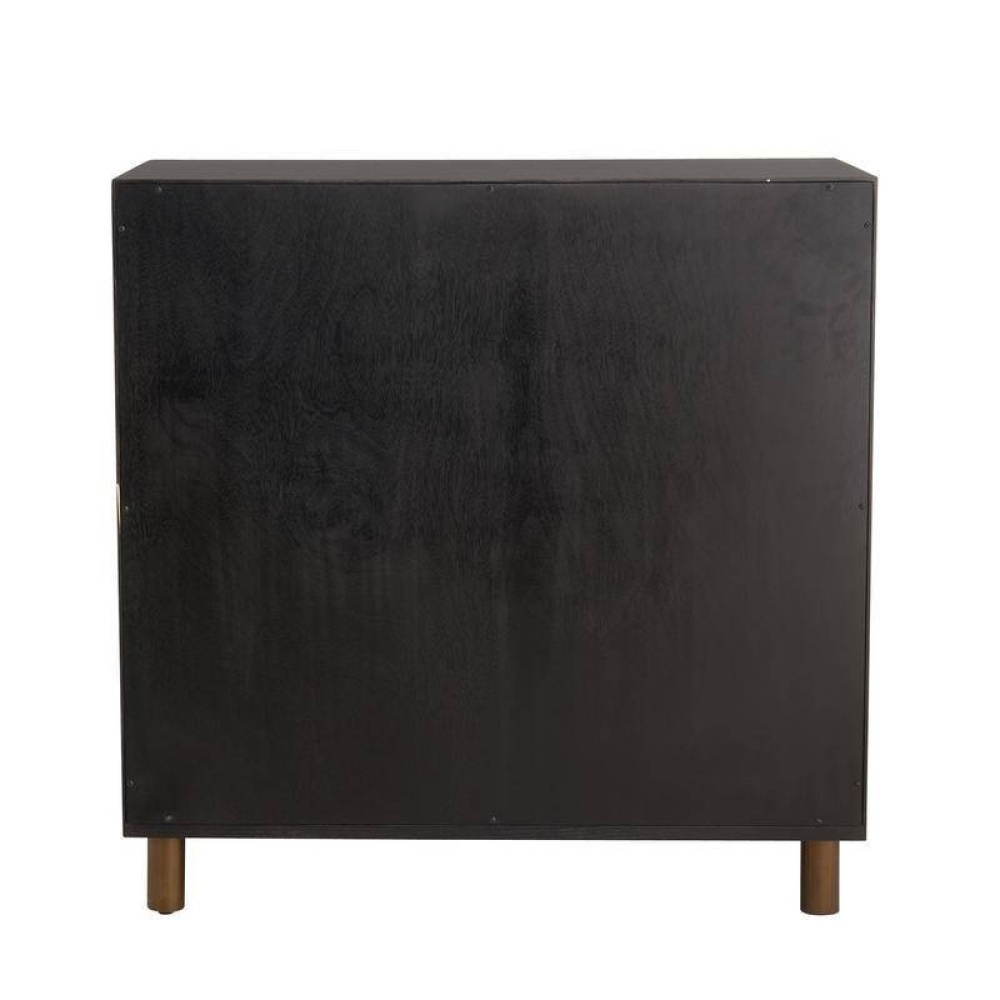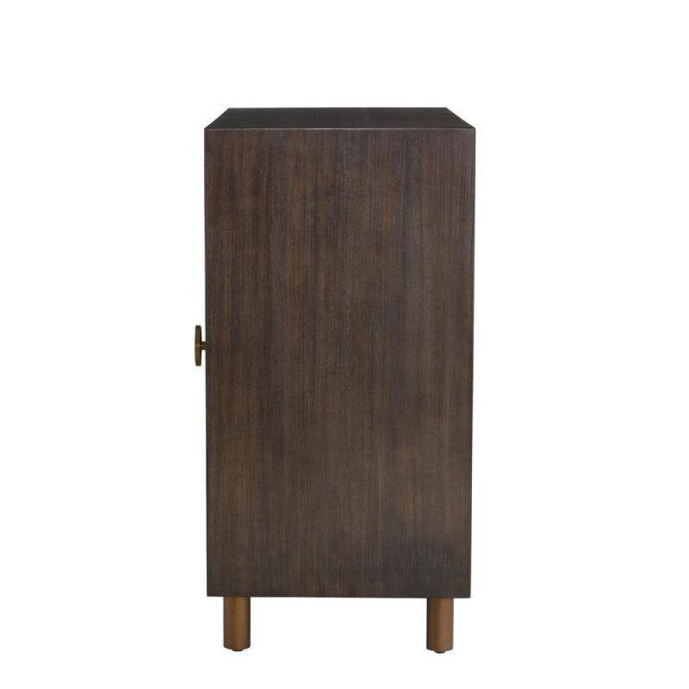 Punctuated by vintage brass inlays, this olive ash veneer cabinet is reminiscent of a fashionable tailored and buttoned vest. The truffle burl finish adds a hint of graphic glamour while playing up the dramatic contrast with the blending hardware. Double soft-close doors open to reveal two adjustable shelves. Encased in a matching truffle olive ash veneer frame. Finish will vary.