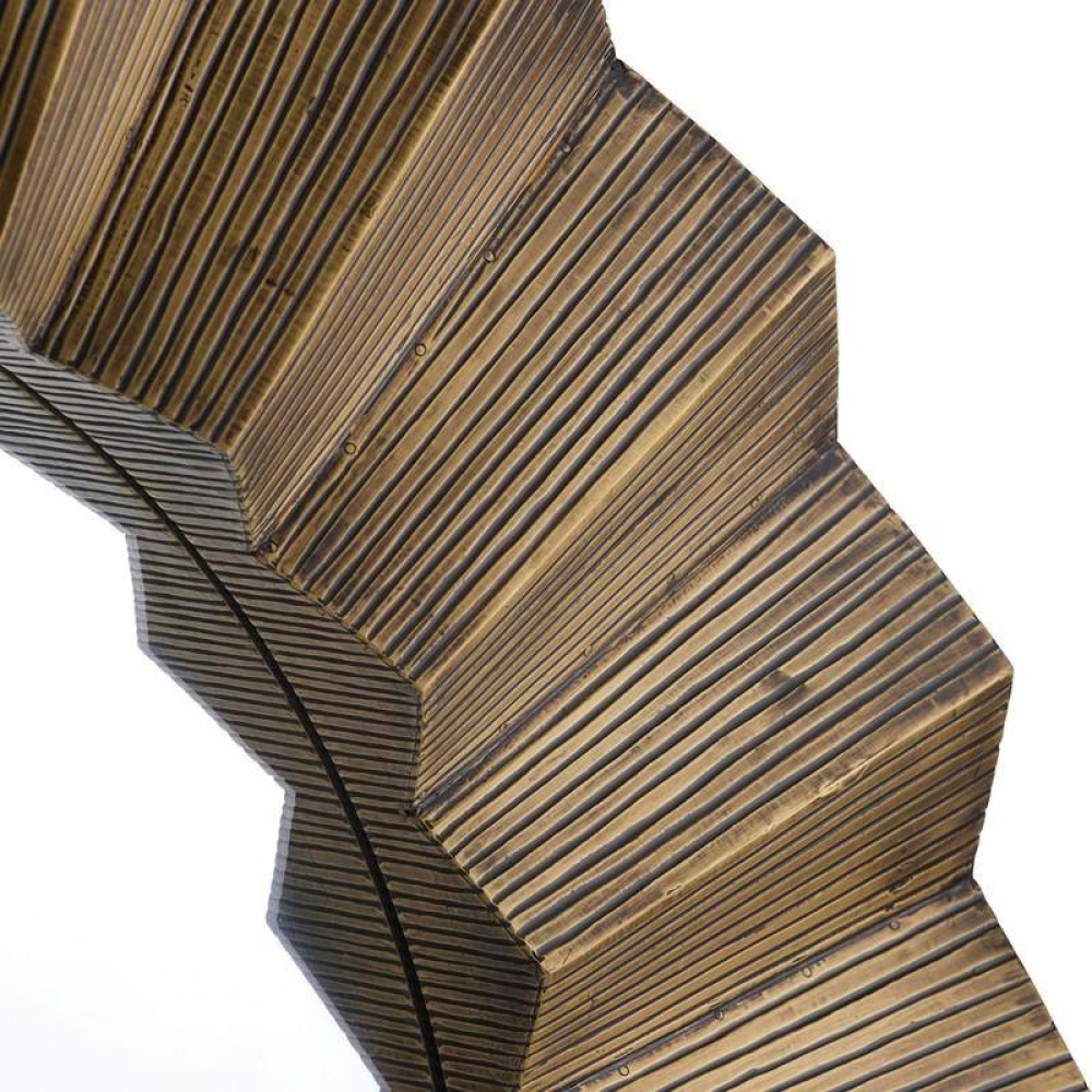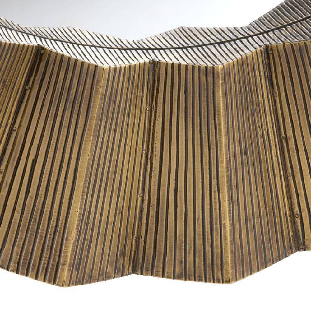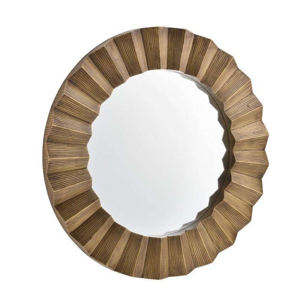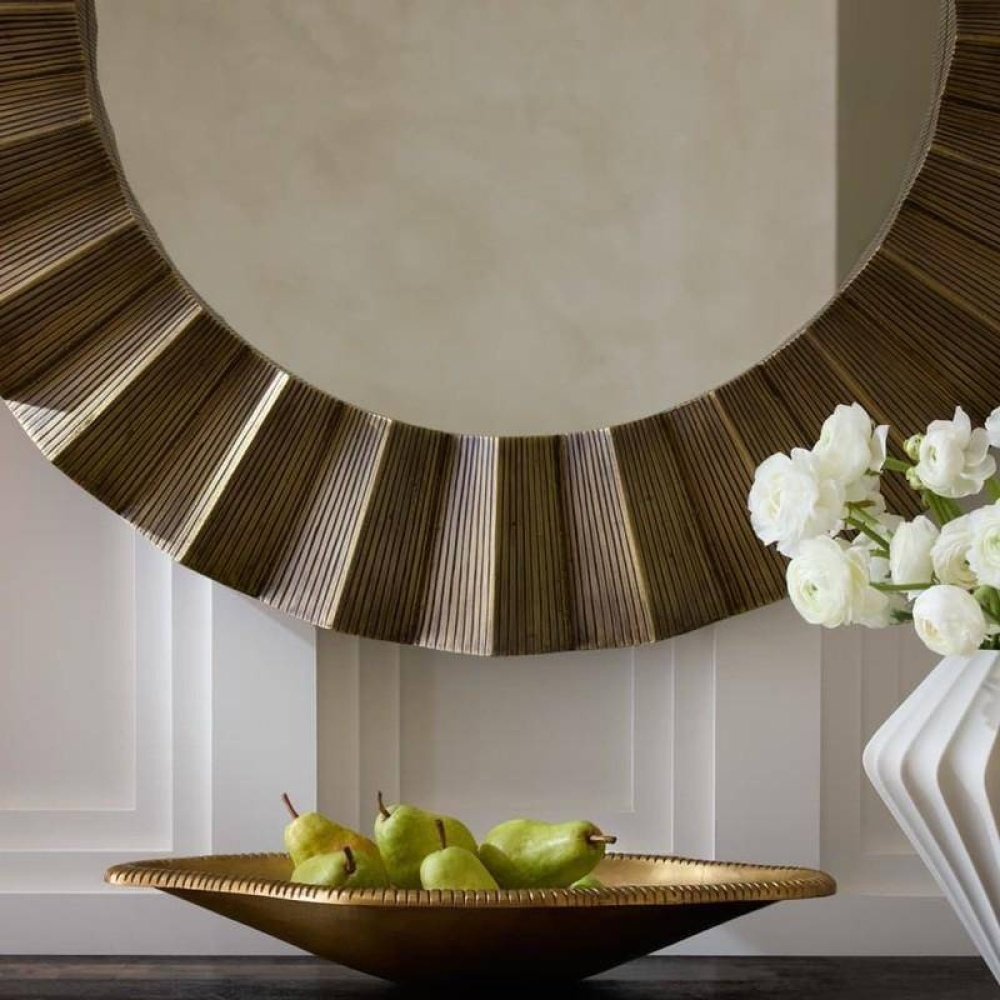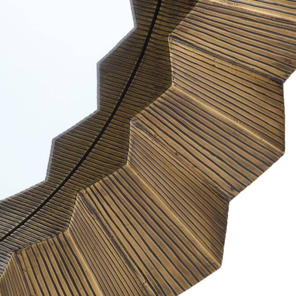 The textural frame delivers a starburst effect that is never less than statement-making. Brutalist-influenced, the dark antique brass-clad faceted frame perfectly juxtaposes the round mirror. Designed to be hung horiztontally or vertically by a back cleat, it includes hanging hardware. Finish will vary.