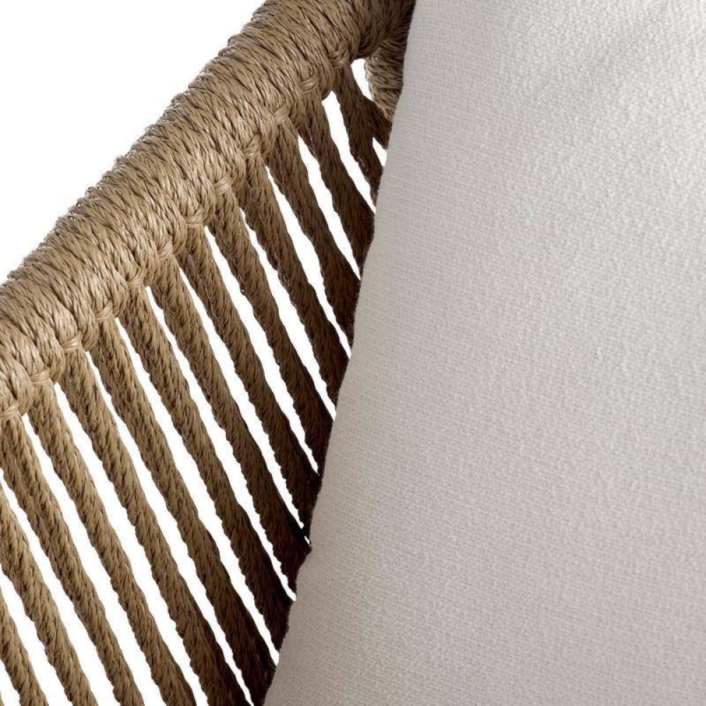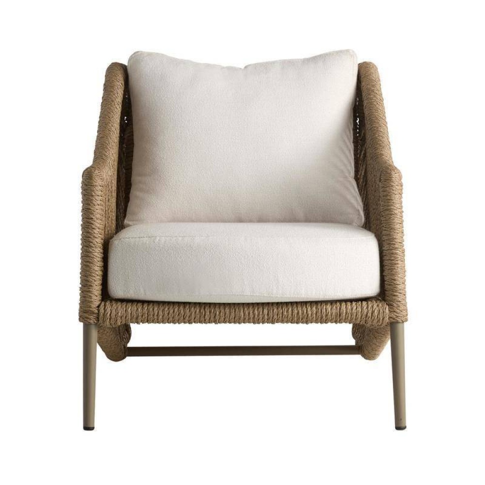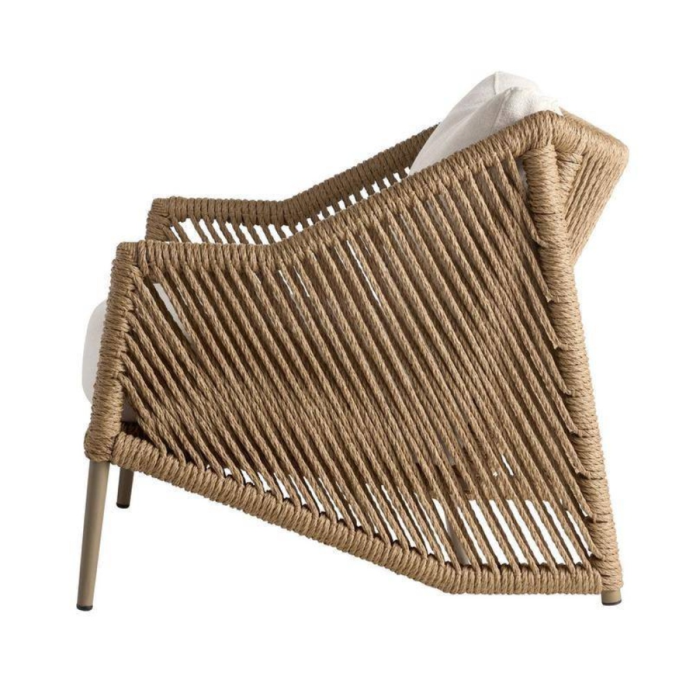 Made to cradle the body, the rope-like form of this tan woven synthetic rattan chair invites pure relaxation. Constructed with a diagonal weave, its angular form is suspended on a framework of beige aluminum. A seat and back cushion of pearl outdoor performance bouclé add to the comfort of this inviting style.