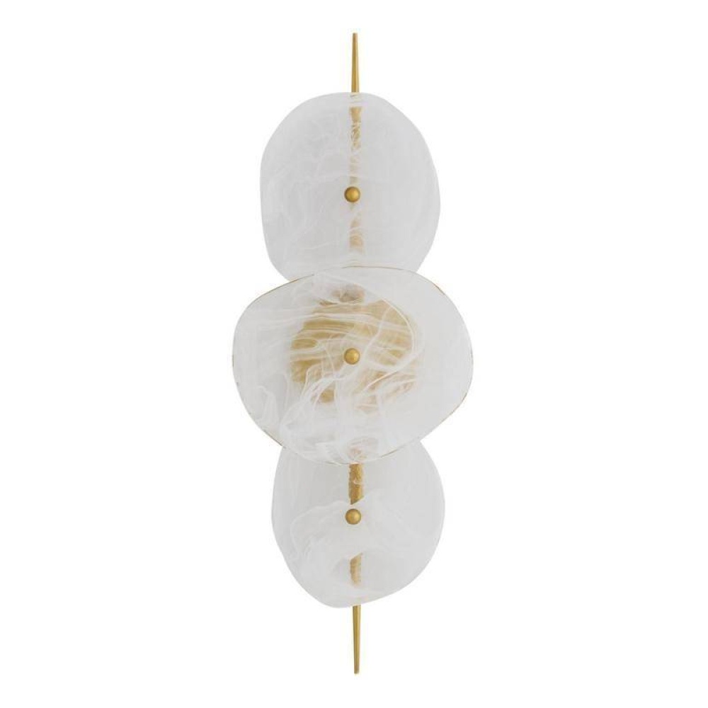 A slim kabob-like backplate lends a pierced effect to shades of hand-blown white glazed glass. Offering a mix of transparency and opacity, each free-form shape is secured with a steel antique brass finial detail and will differ slightly from fixture to fixture. Finish will vary. Damp-rated, although limited, covered outdoor conditions may affect finish.