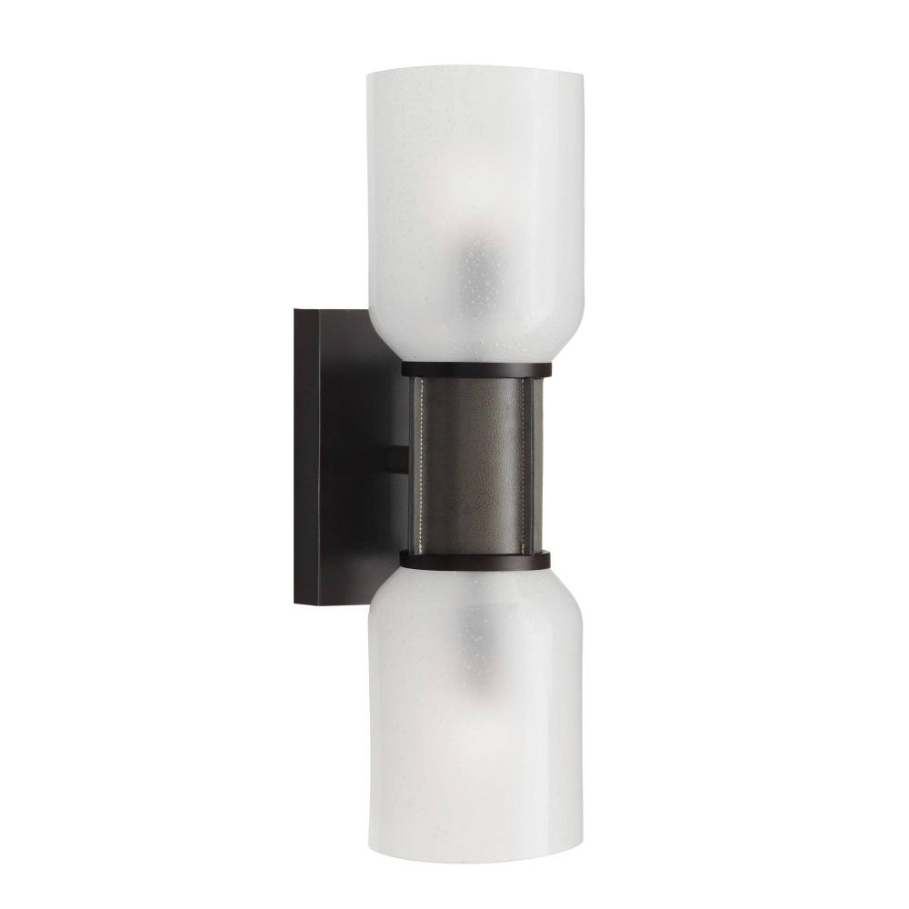 Dual shades of opaque frosted seeded glass are cinched at the center with a topstitched cuff of graphite leather. Highlighting the artisanal craftsmanship, a raw-edge detail adds textural interest. Supported by a rectangular English bronze-plated steel backplate. Finish will vary.