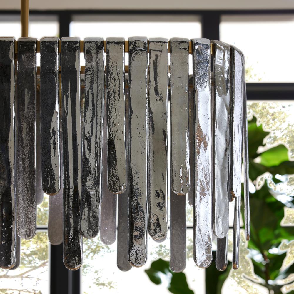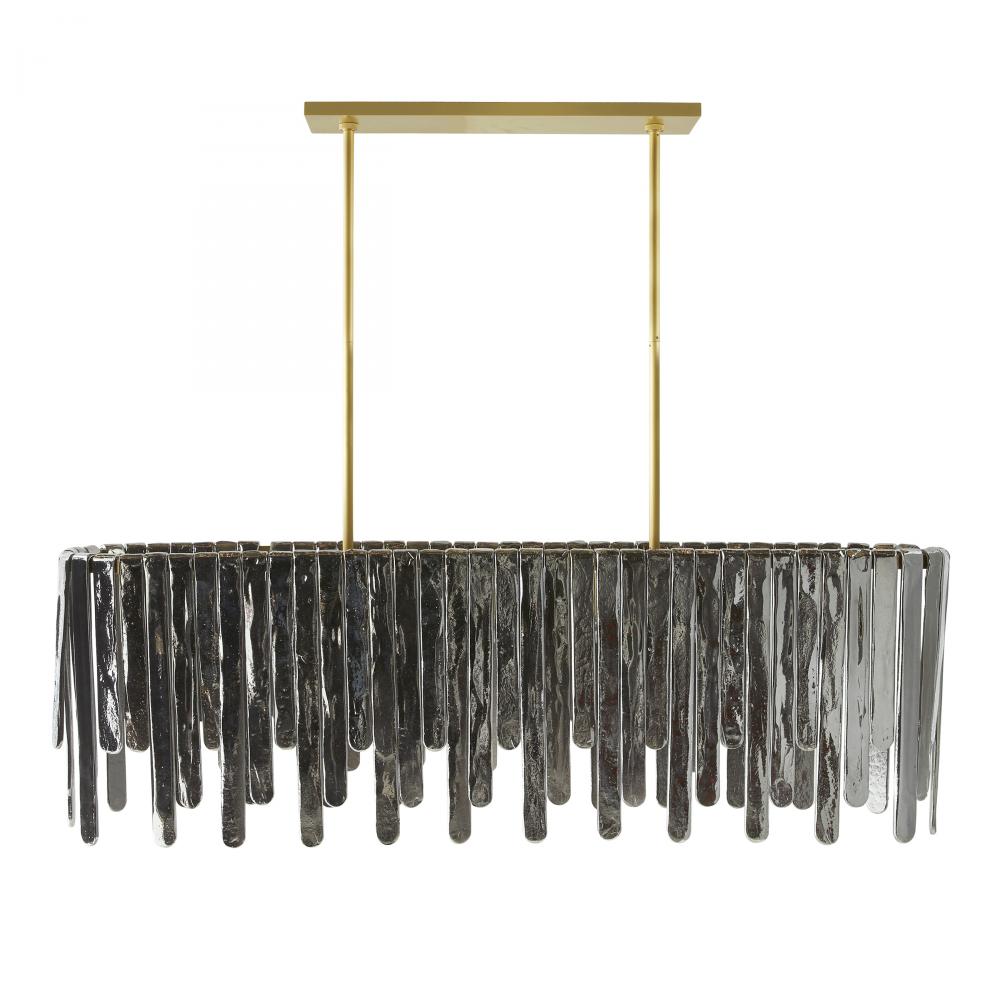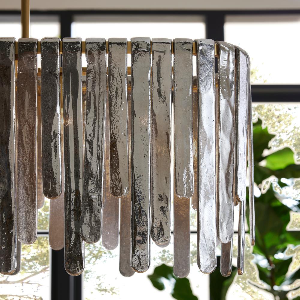 Inspired by the majestic beauty of Multnomah Falls, the Leighton provides a dramatic sense of movement through each unique cascading element. Panels of smoke luster slump glass suspend from an oblong antique brass-plated steel frame. Varying in size and alternating in height, each offers a lustrous glimmer to create its own unique lights cape. Additional pipe available. Finish will vary.