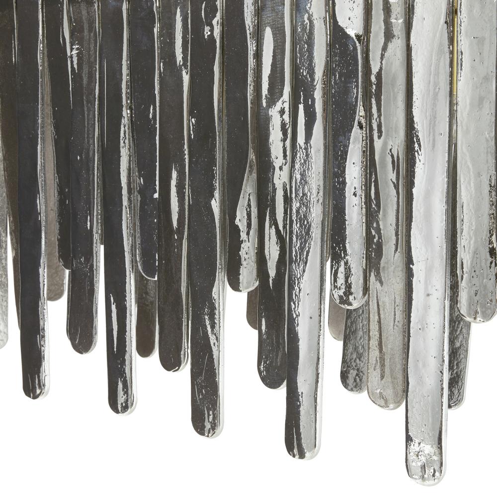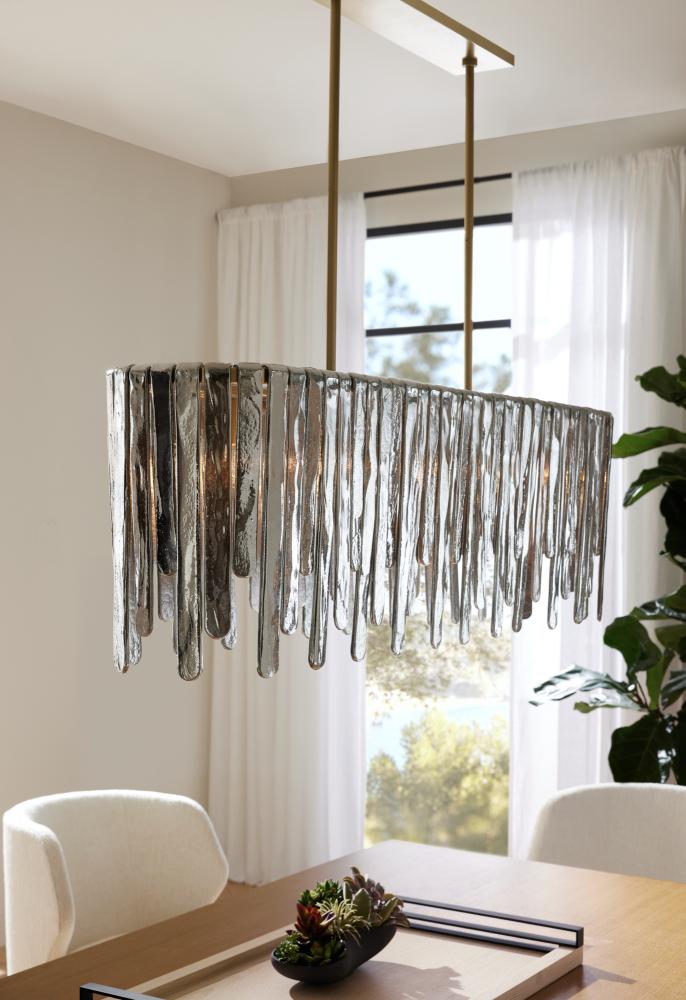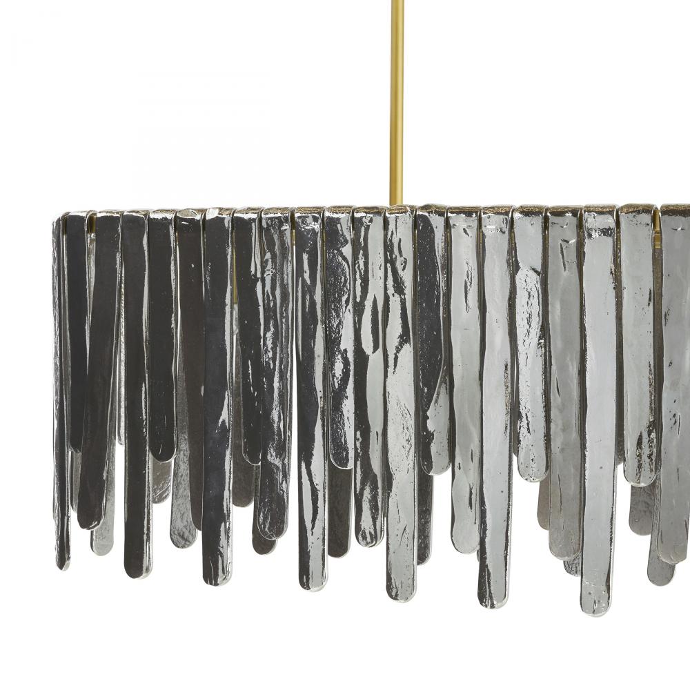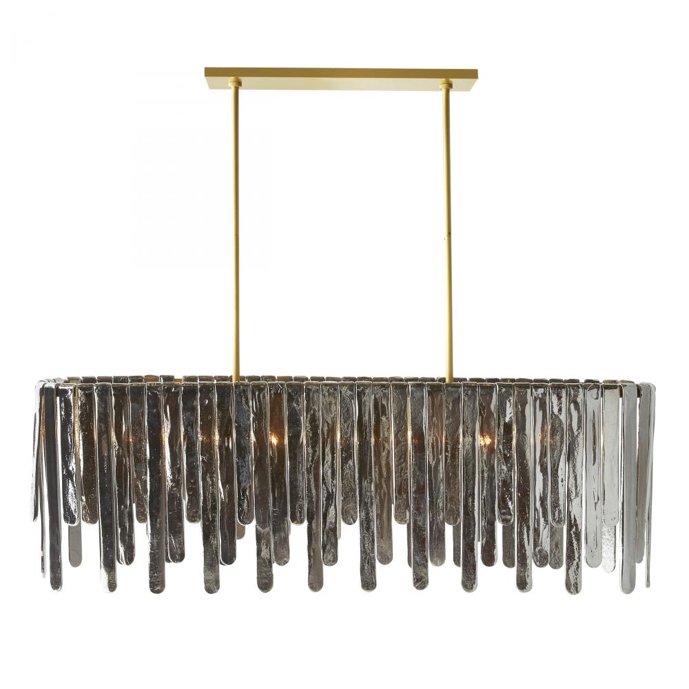 Inspired by the majestic beauty of Multnomah Falls, the Leighton provides a dramatic sense of movement through each unique cascading element. Panels of smoke luster slump glass suspend from an oblong antique brass-plated steel frame. Varying in size and alternating in height, each offers a lustrous glimmer to create its own unique lights cape. Additional pipe available. Finish will vary.