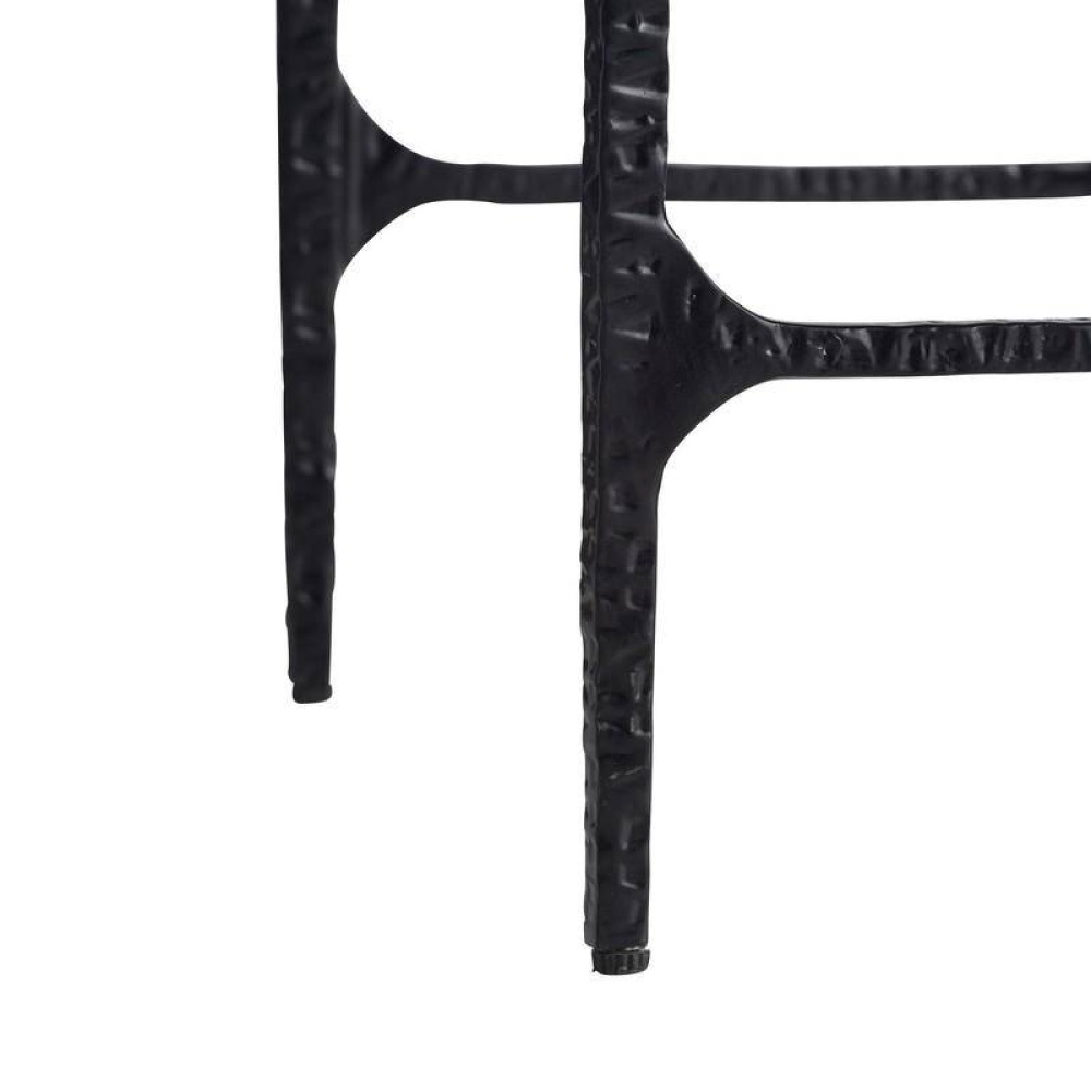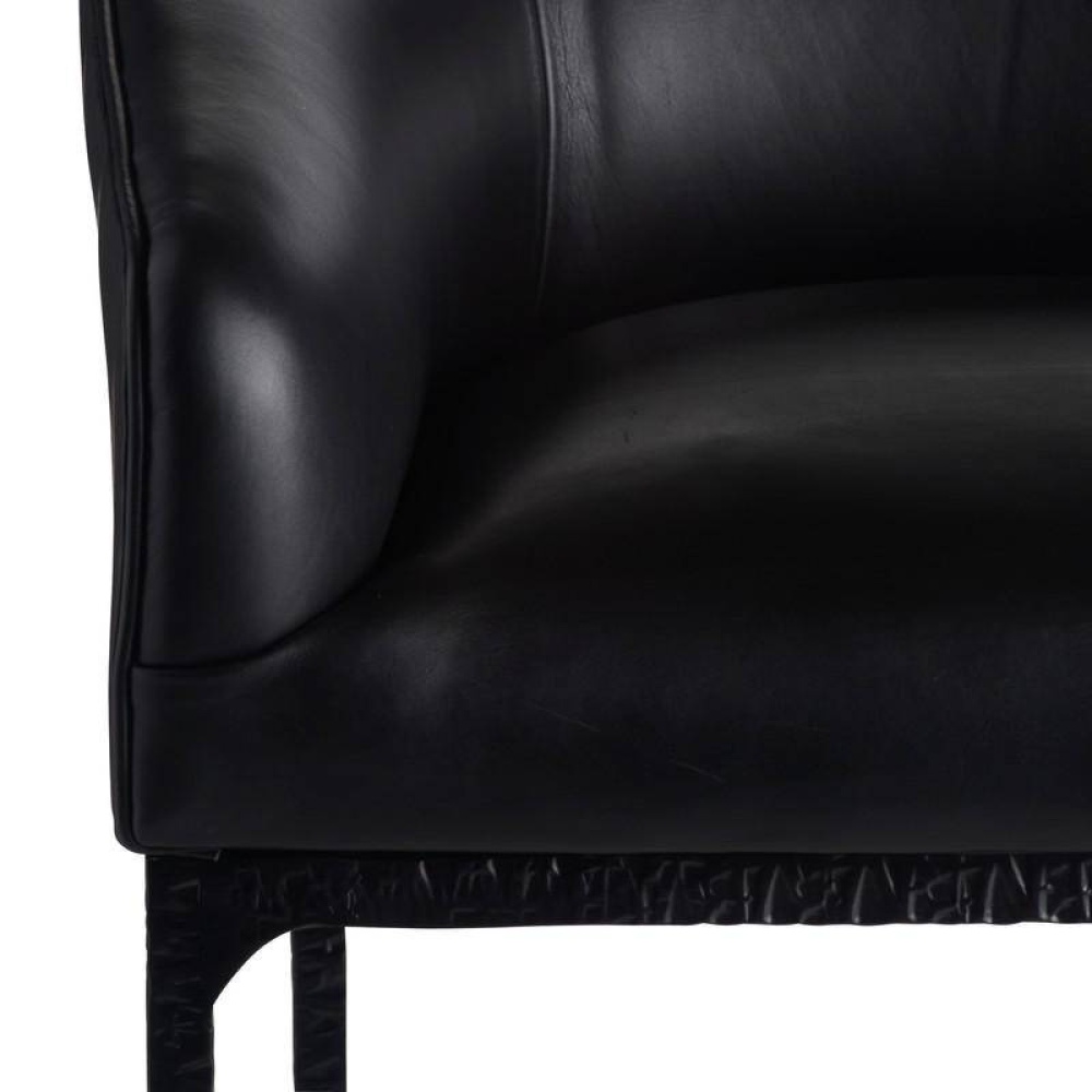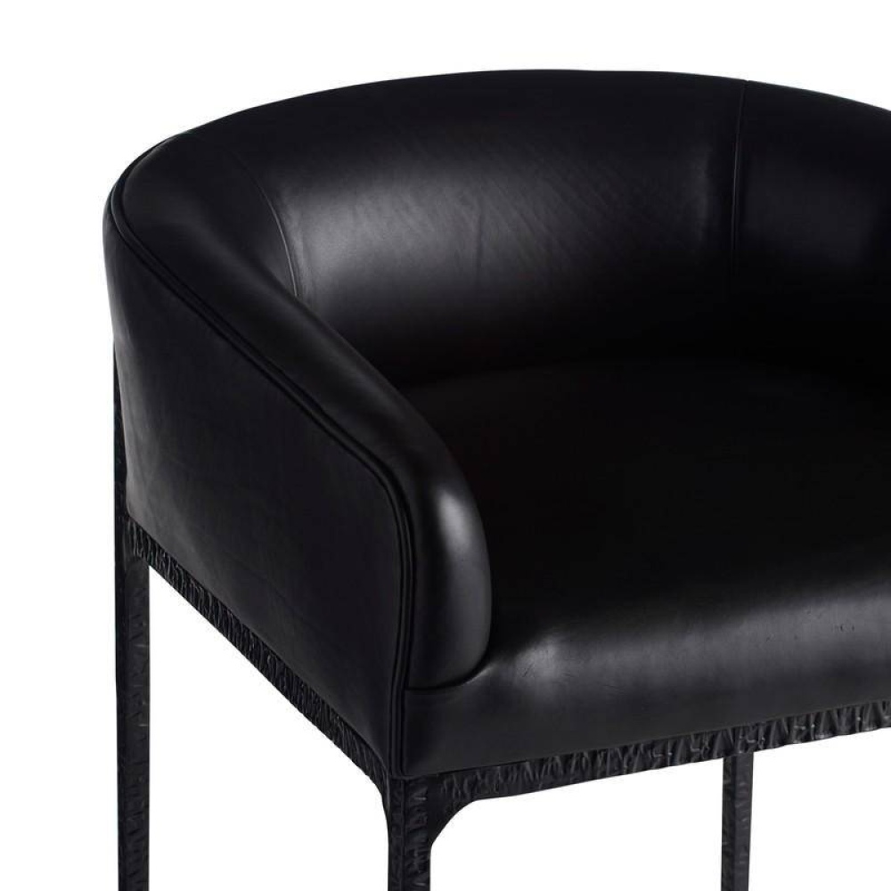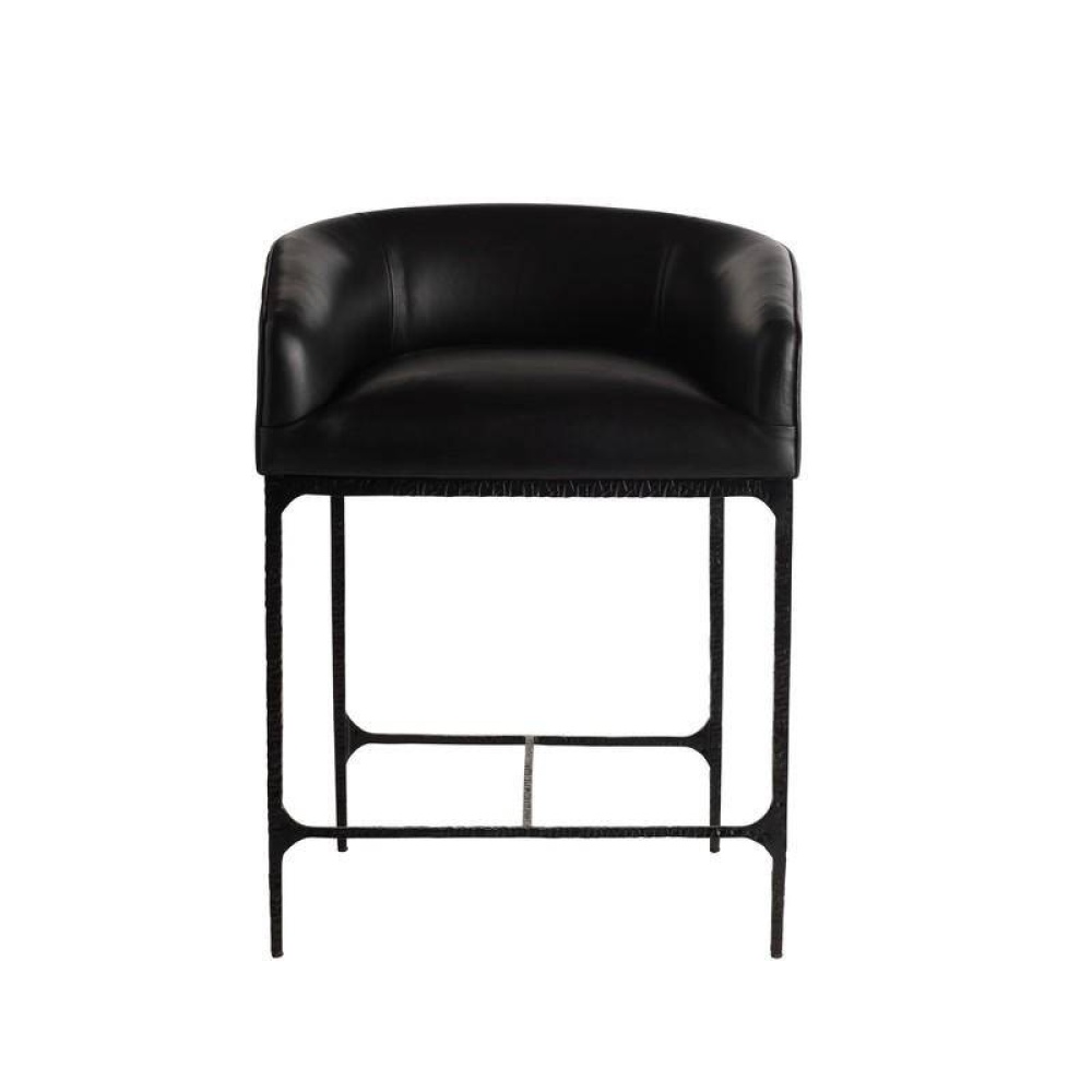 A hammered blackened iron frame and handsome black leather make this counter stool ultra-chic. The low, barrel-style shape gives lumbar comfort and support while allowing the stool to tuck neatly under a countertop. The modern style brings sophistication and polish to a space. Finish will vary.