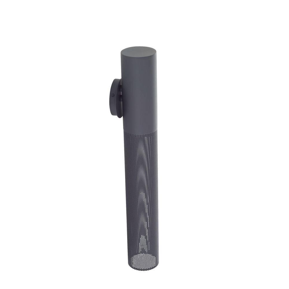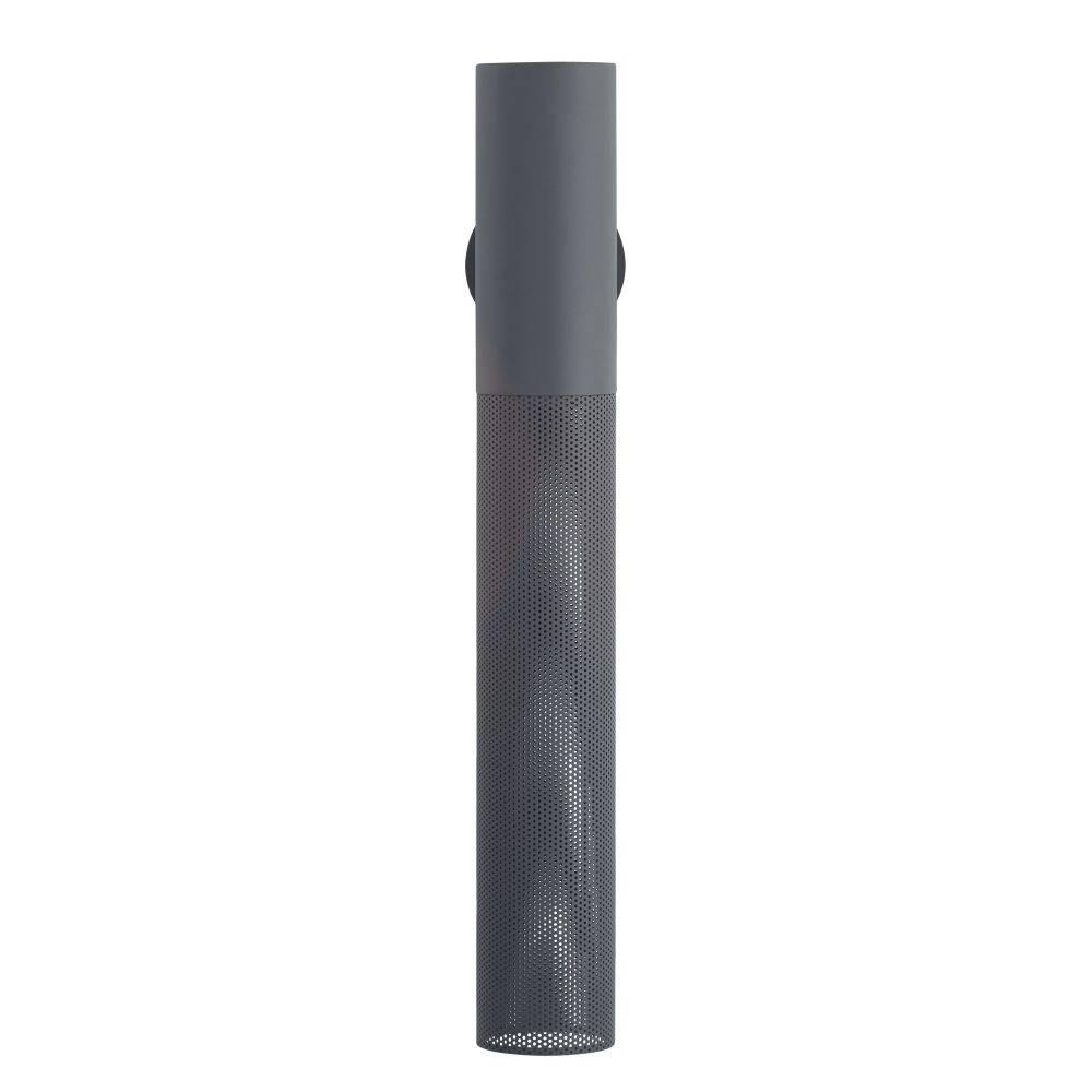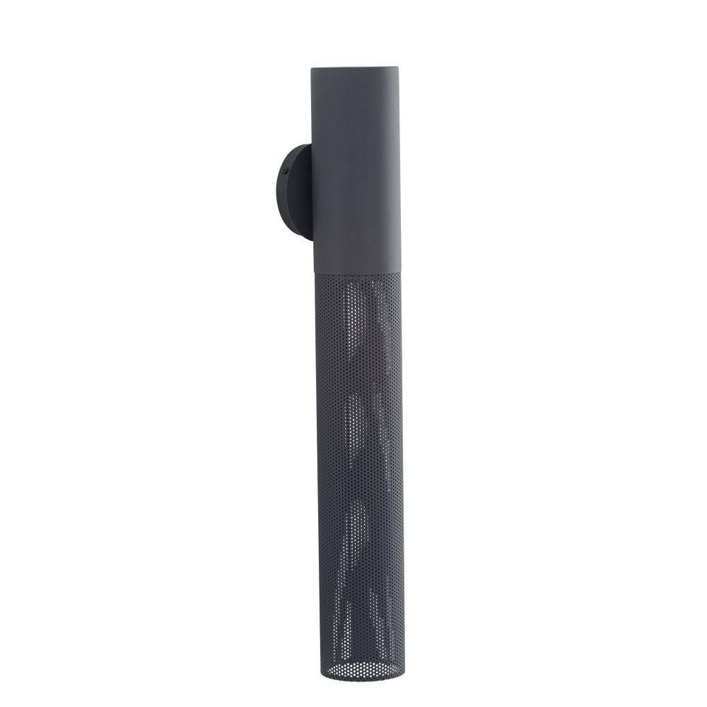The Punch Large Outdoor Sconce is a subtle, linear option for exterior spaces. A perfect pairing of solid and perforated aged graphite steel cylinders on a rounded mounting plate, Punch casts a diffuse downward glow. A protective coating helps withstand the elements.
