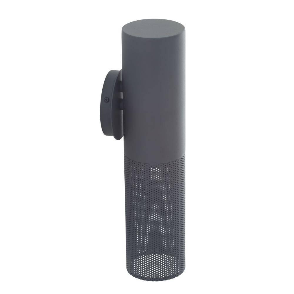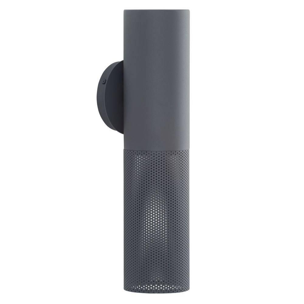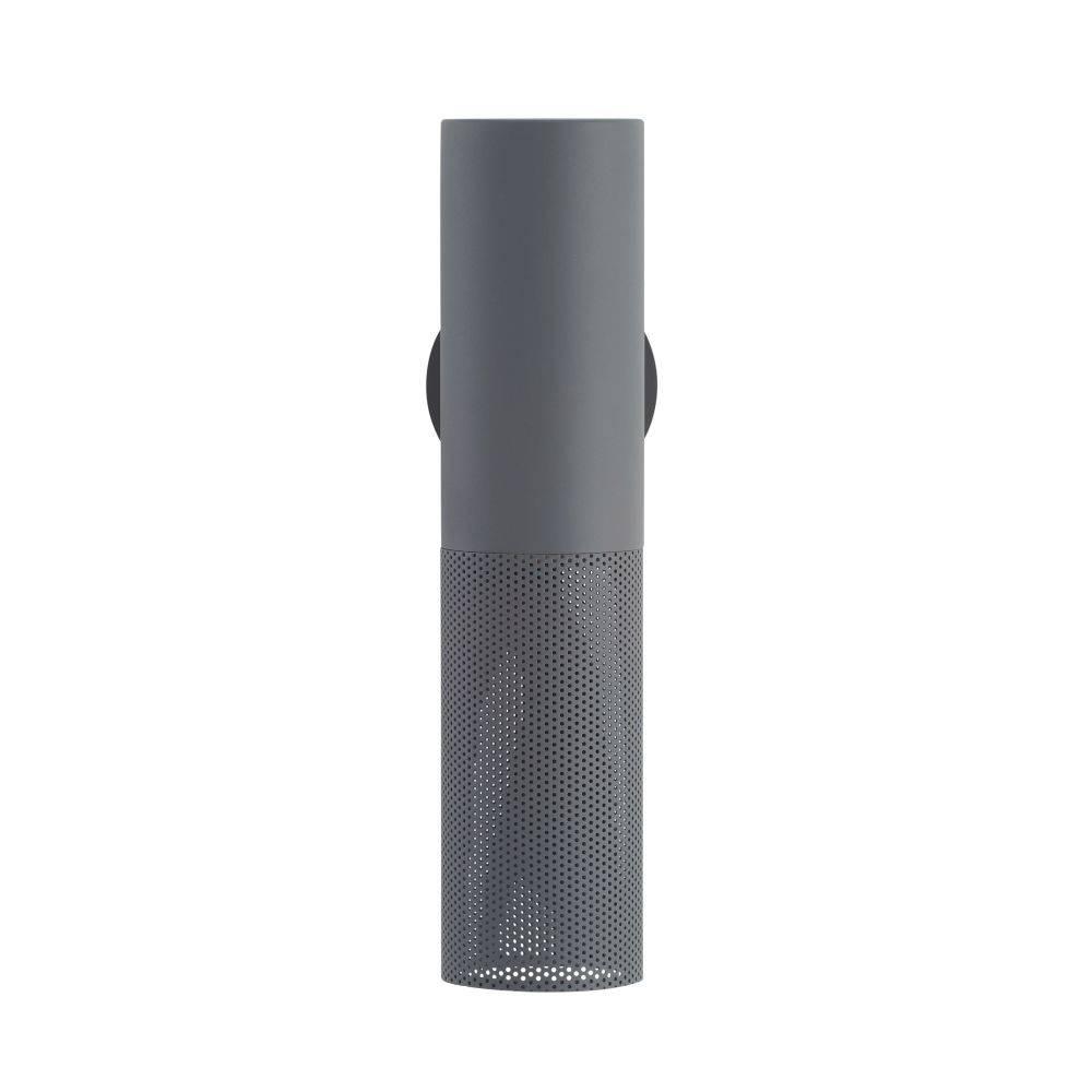 The Punch Small Outdoor Sconce is a subtle, linear option for exterior spaces. A perfect pairing of solid and perforated aged graphite steel cylinders on a rounded mounting plate, Punch casts a diffuse downward glow. A protective coating helps withstand the elements.