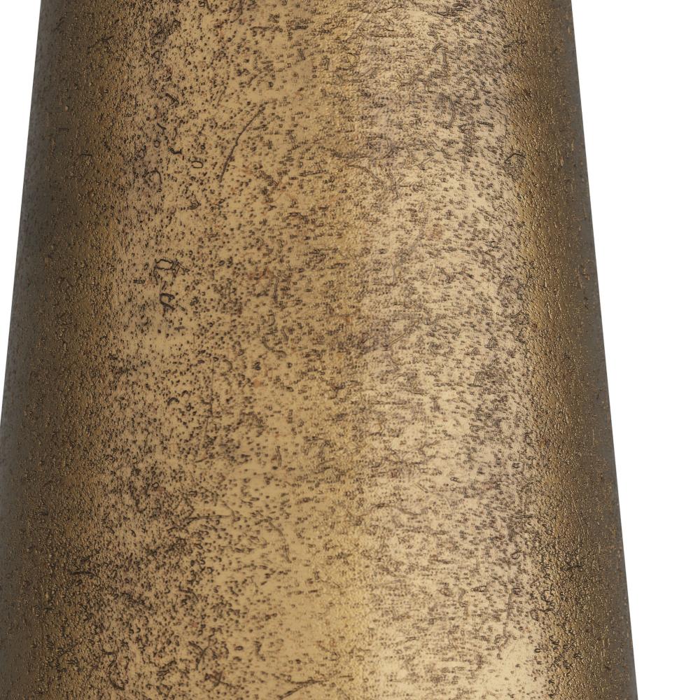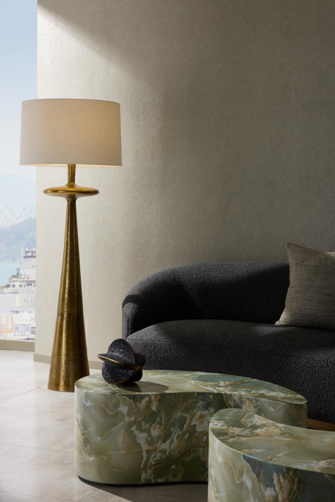 Inspired by the Putney lamp, we created a large-scale version. From each direction, its silhouette reveals three stacked rounded forms—a cylinder, a disc, and an elongated tapered coin base. Showcasing angular composition and balance, it has a mid-century feel with an updated take on the style via its cast aluminum in an antique brass finish. Topped with an off-white linen shade with off-white cotton lining. Clear silver cord and three-way rotary switch.