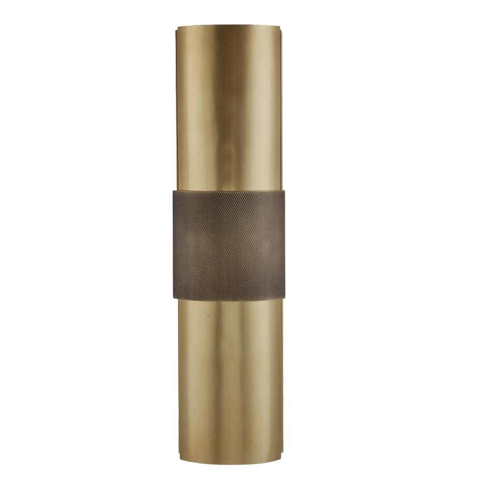 Simple yet striking, our Samuel sconce is a masterful mix of materials and textures. A reflective demilune column of antique brass iron is interrupted with a contrasting decorative band of knurled antique brass iron. The modern LED sconce, fitted with a frosted acrylic interior diffuser, casts a back-lit glow.