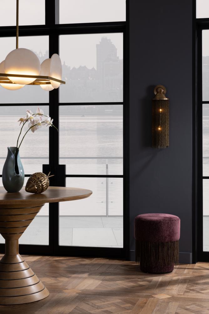 ART DECO STYLE AND A NOD TO MESOAMERICAN ART, PROVIDED INSPIRATION FOR THE TASSELED VANKO SCONCE. THE STATEMENT PIECE IS CREATED WITH A CAST, ANTIQUE BRASS HEAD, IN AN AZTEC-STYLE SILHOUETTE, AND A FALL OF FRINGE CREATED IN ANTIQUE-BRASS IRON. FINISH WILL VARY. DAMP-RATED, ALTHOUGH LIMITED COVERED OUTDOOR CONDITIONS MAY AFFECT FINISH.