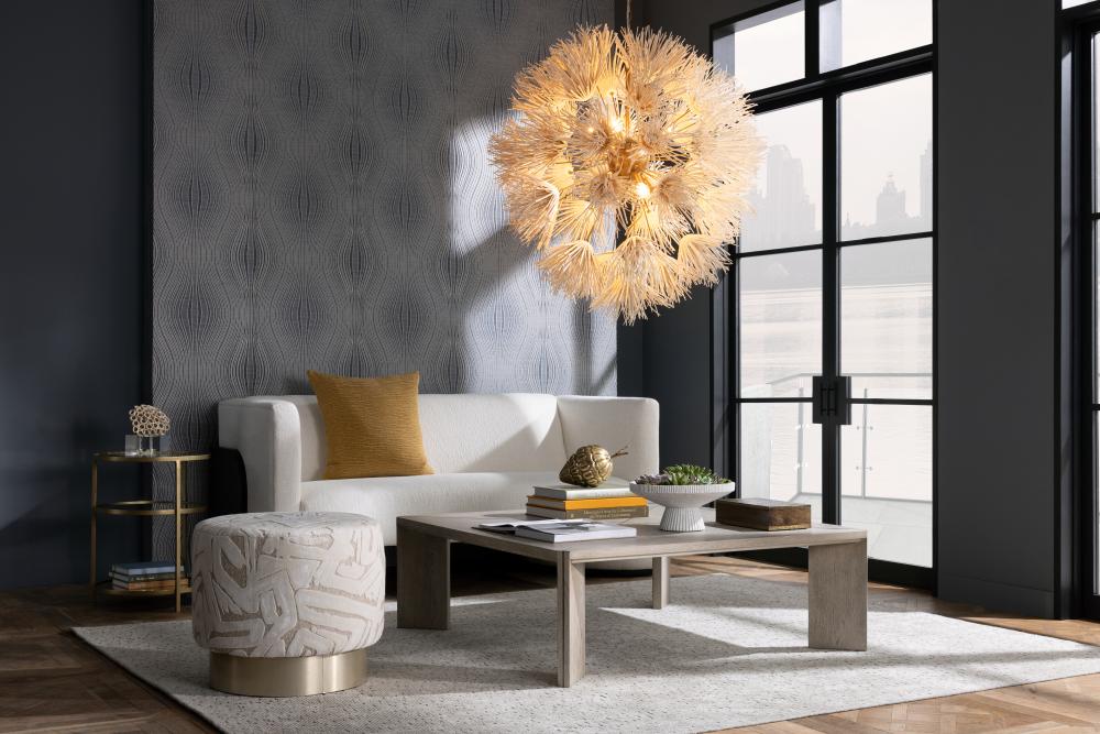 WILD AND WORLDLY, THE WINONA CHANDELIER IS CLEVERLY CRAFTED WITH IVORY COCONUT SHELLS THAT ARE HAND-FORMED INTO DELICATE DANDELION SHAPES. THE ARTISANAL PIECE, IN AN ACORN-SHAPED SILHOUETTE, IS CONSTRUCTED WITH A CHAIN LINK SUSPENSION IN ANTIQUE BRASS STEEL. FINISH WILL VARY.