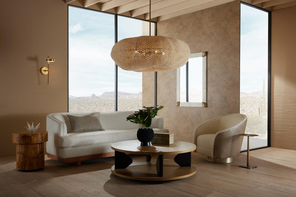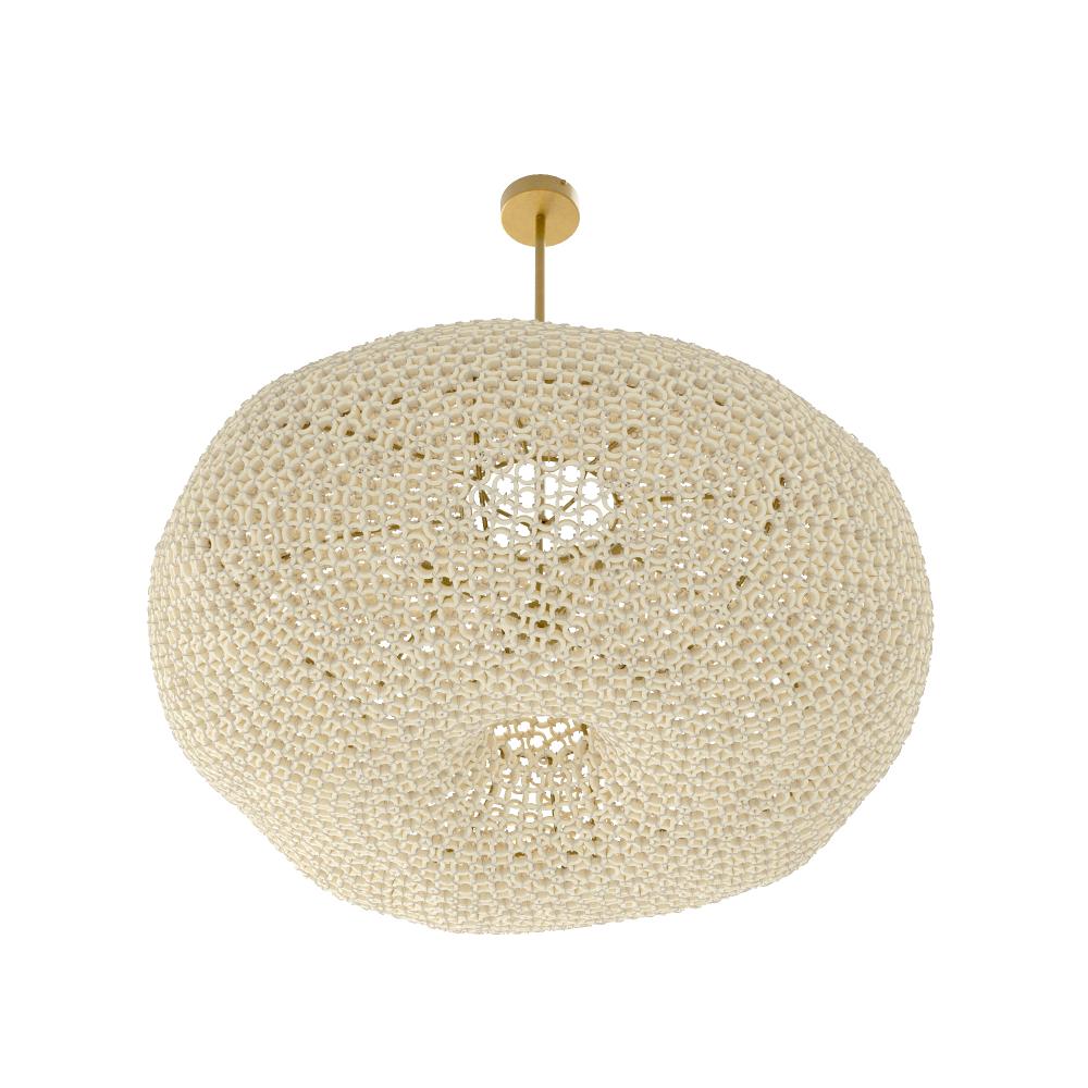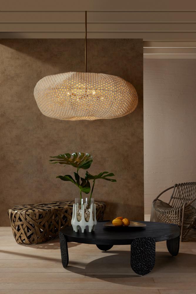 Natural coco shells are strung together to reflect a dreamy cumulous cloud. Hung from an iron pipe finished in antique brass, the asymmetrical form of the Yara was made to reflect intriguing shadows on walls and ceilings. This design was made from sustainable materials. Finish will vary.