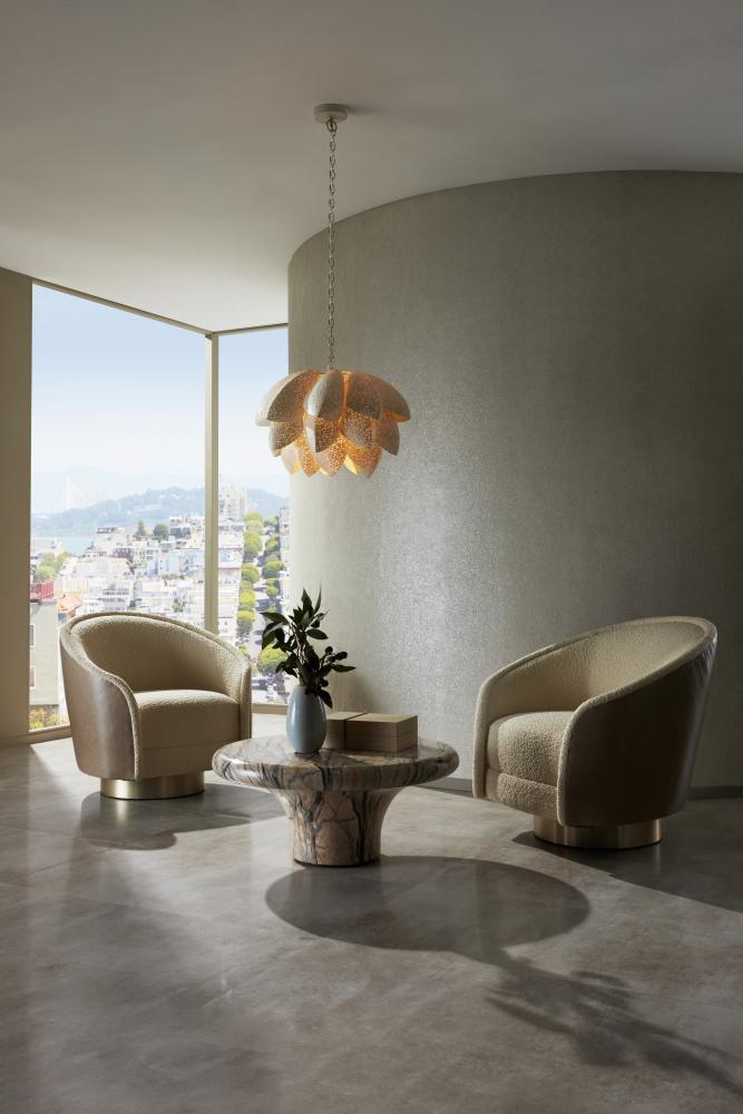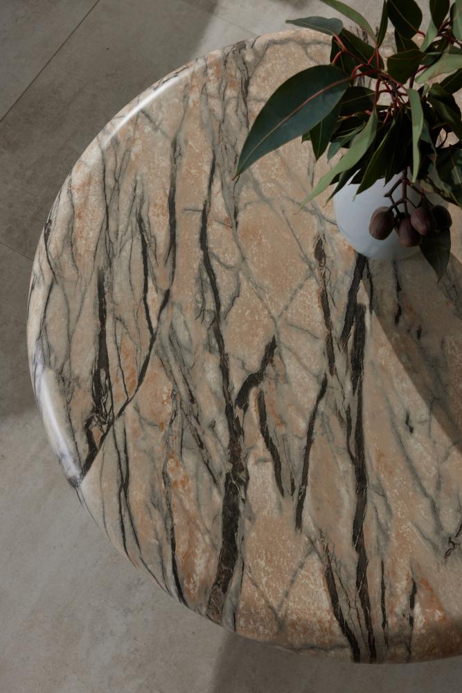 With a cinched waist and floating top, this bullnose design takes its inspiration from mid-century Italian sculpture. Crafted of lightweight concrete with a mojave finish, a marble-like façade is achieved through a process called hydrographics, assuring each piece will vary in color and veining.