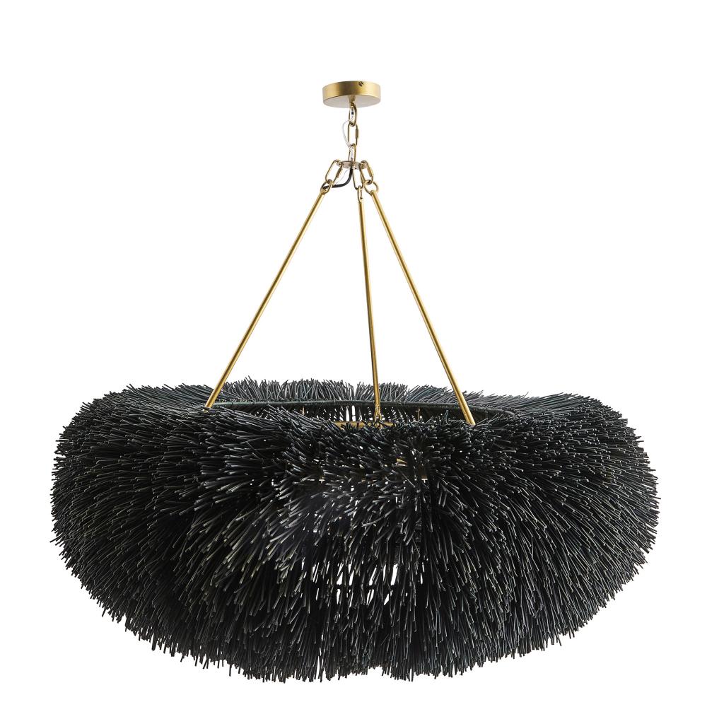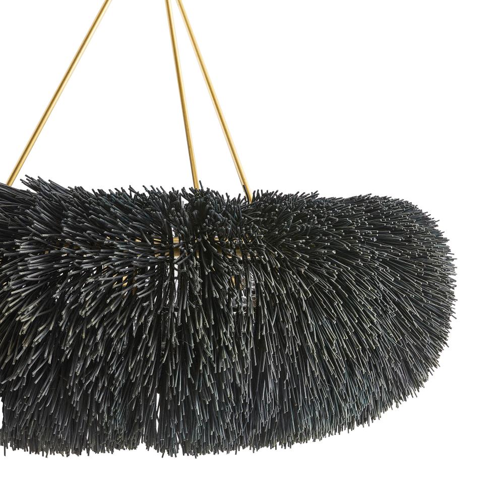 A play of shadow and light peeks through woven rattan in a classic ring silhouette. Stained in black and suspended from a trio of antique finished pipes and chain, Zaria was made to reflect intriguing shadows on walls and ceiling through the open weave of sustainable rattan. Finish will vary.
