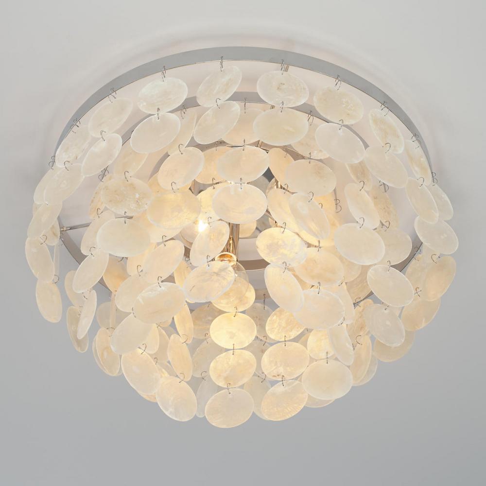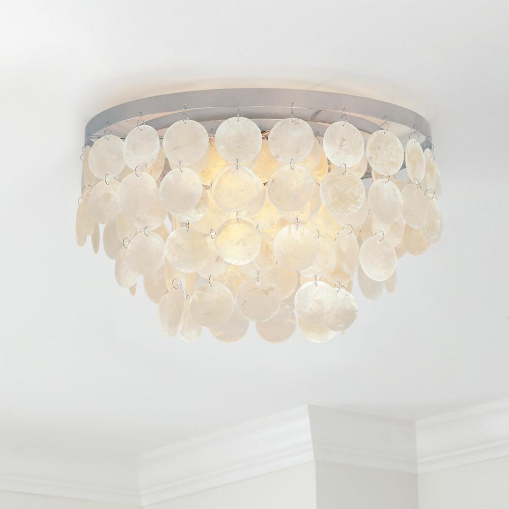 Artistic with a hint of glam, the Shelby Flush Mount features cascading strands of Capiz shells that evoke shimmering coastal style. The Polished Nickel finish makes a cool complement to the seaside design.
