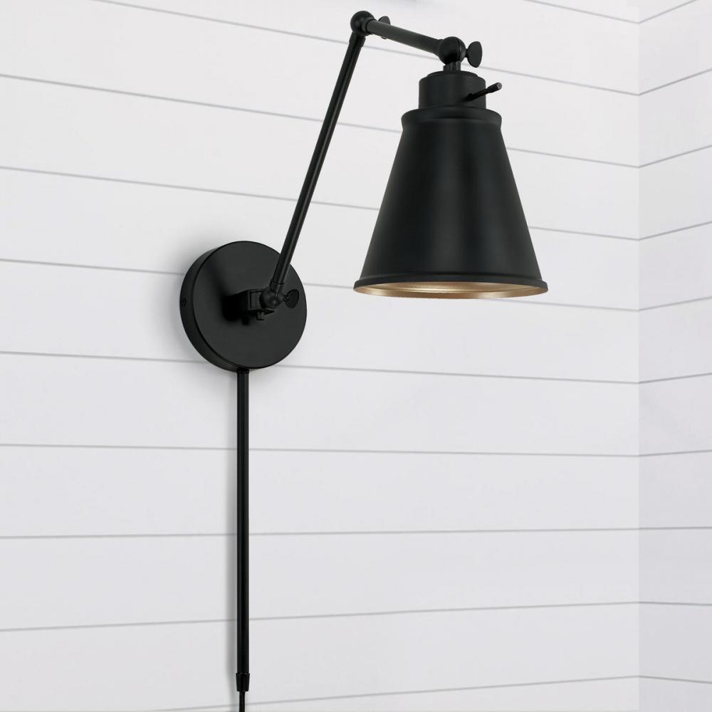 Raise your game with this stunning matte black swing-arm sconce, with soft gold painted interior on the shade for a sophisticated touch