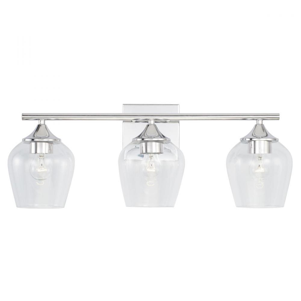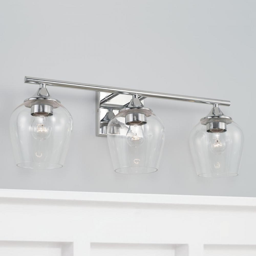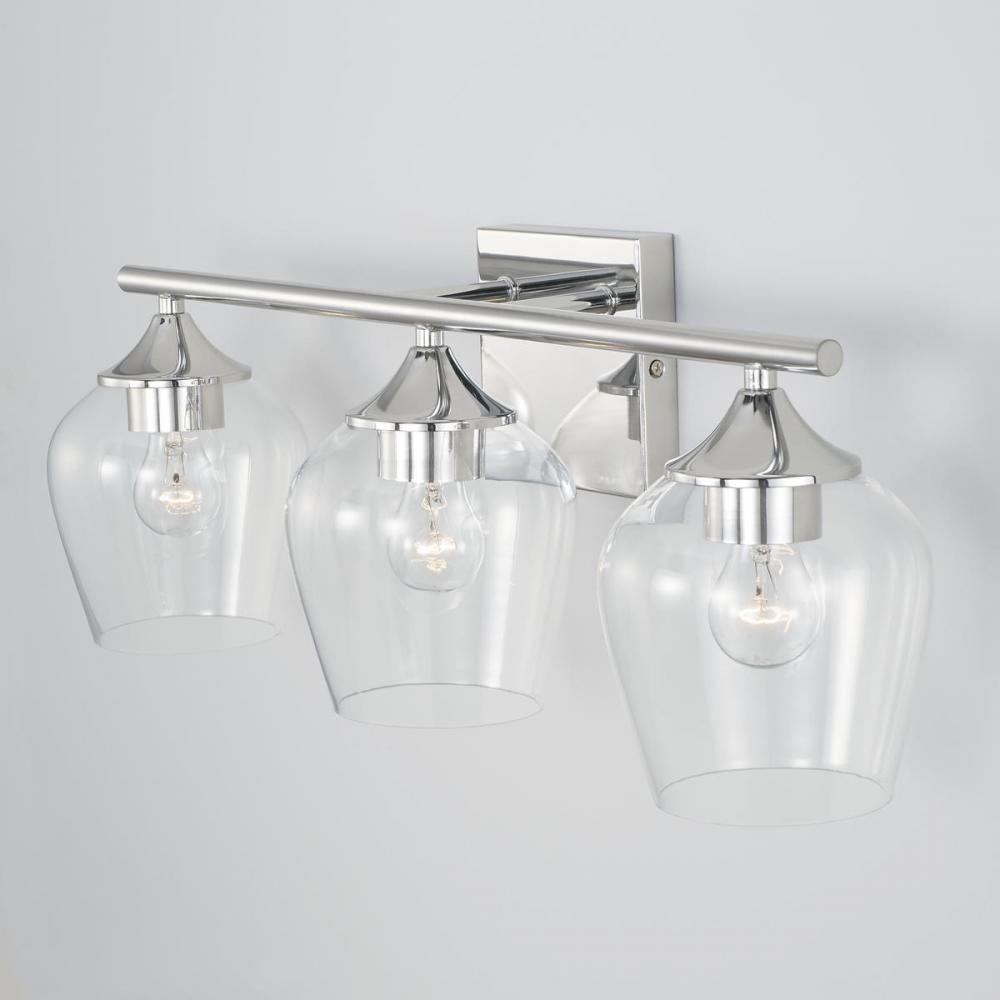 The Reece Vanity is pretty and practical. The Chrome finish adds a reflective layer to the playful silhouette of the clear glass shades.