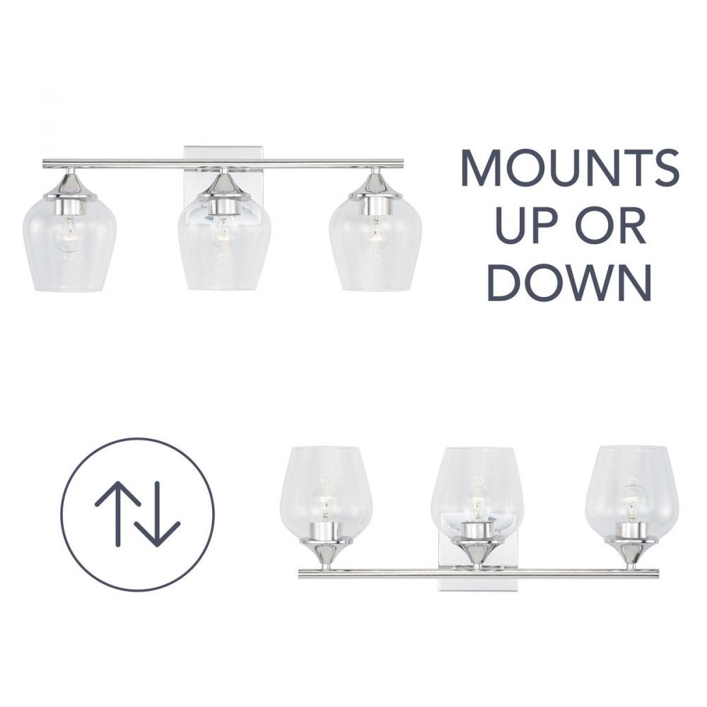 APPLICATIONS: Rated for damp locations, perfect for bathrooms and powder rooms. The brandy snifter design of the clear glass shades ties in perfectly with the clean, chrome finish of this stylish piece