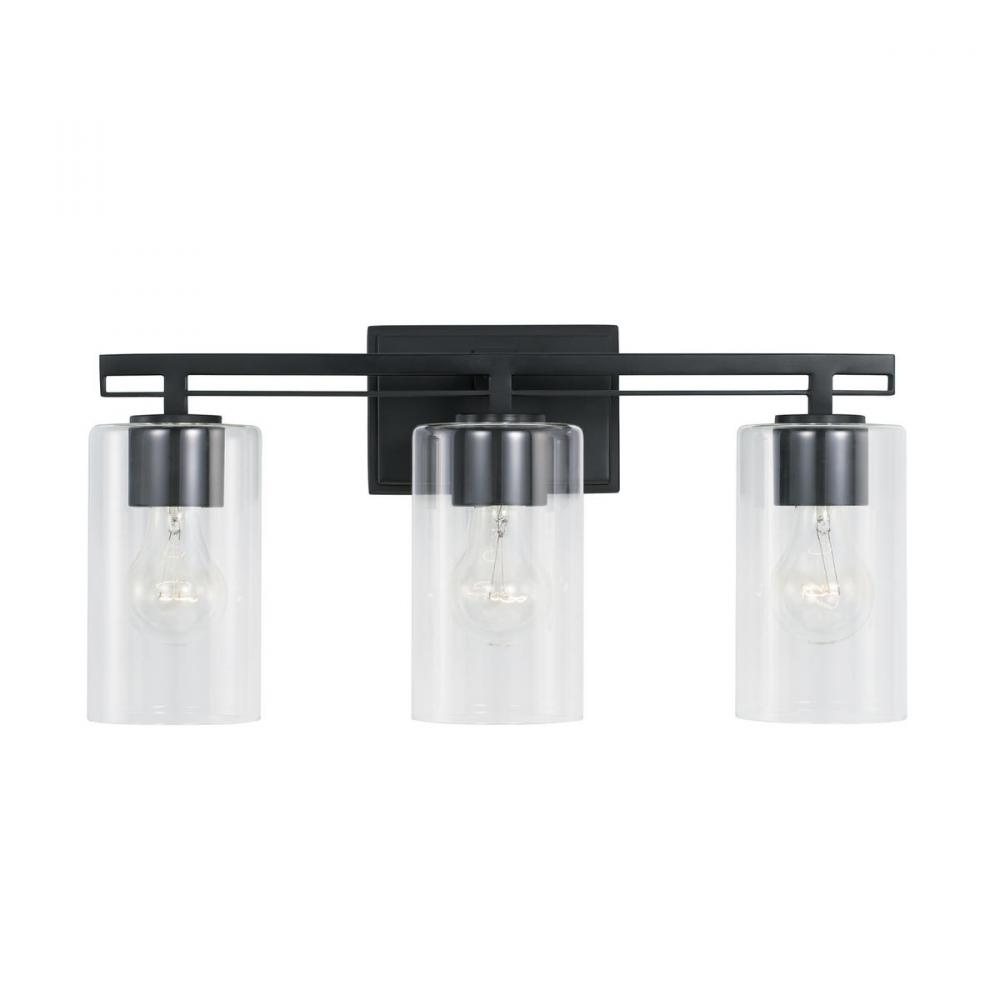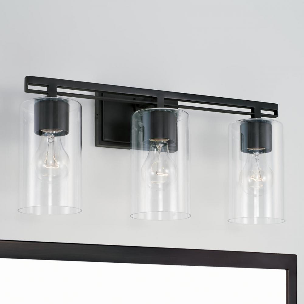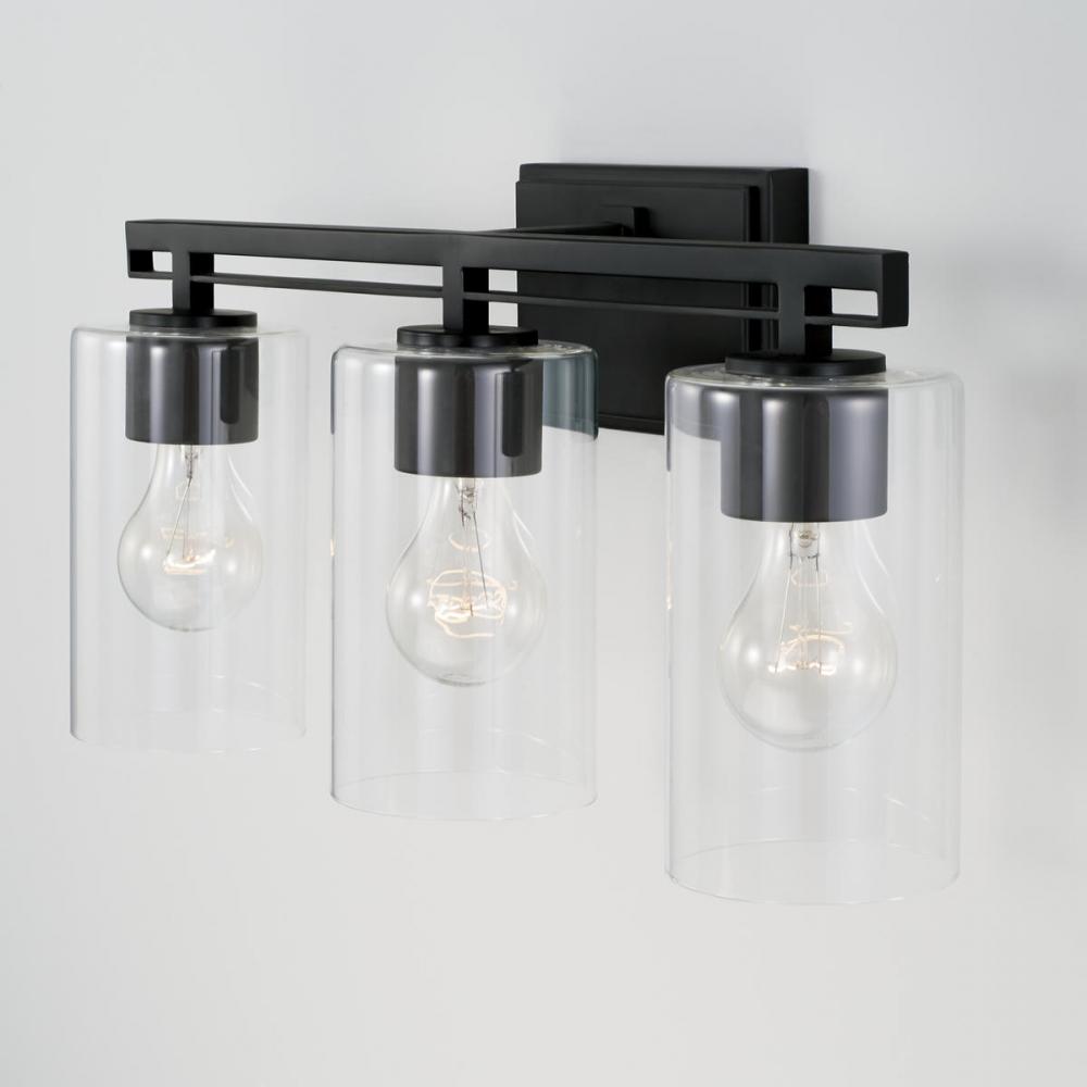 APPLICATIONS: Rated for damp locations, perfect for bathrooms and powder rooms. The matte black design destails in the vanity crossbar, coupled with the clear glass cylindrical shades create a clean, simple look sure to compliment your bathroom