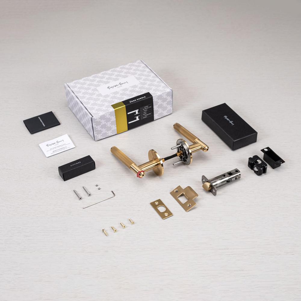 A pair of solid metal door handles, designed for installation