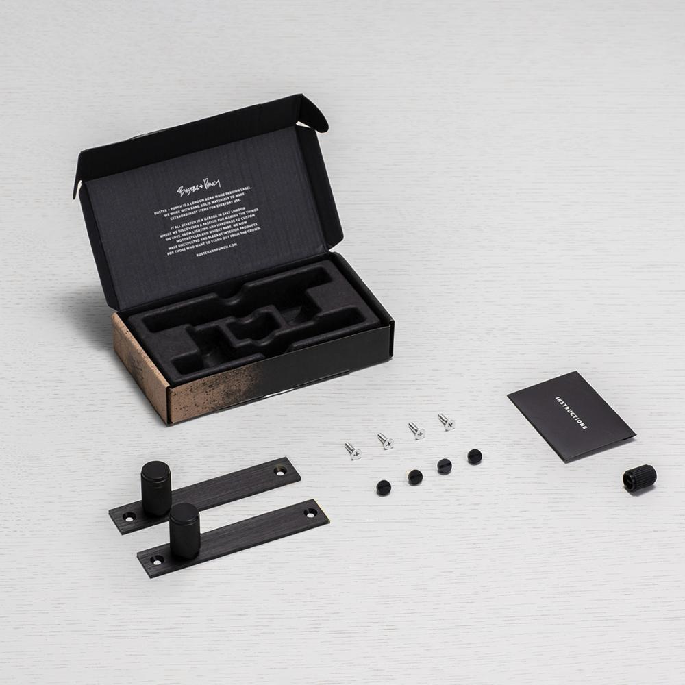 A pair of furniture knobs made from solid black anodised metal. These knobs feature our signature, diamond-cut, cross-knurl pattern. They come complete with black metal backplates and are fixed with black metal coin screws.